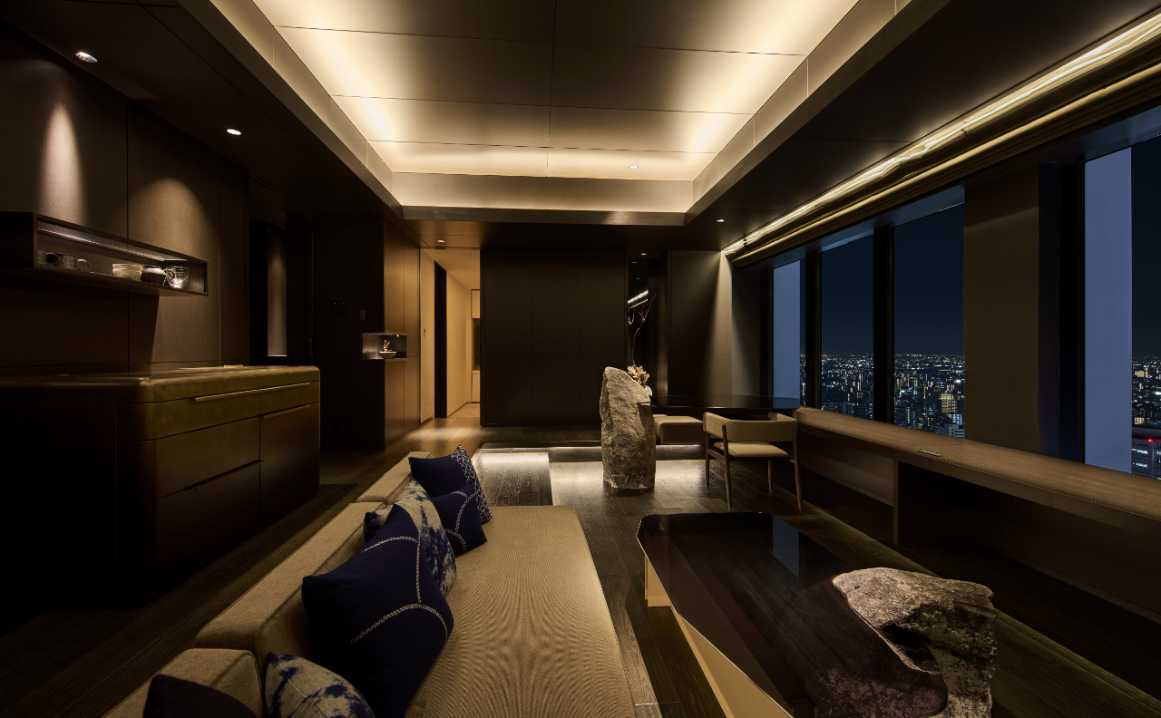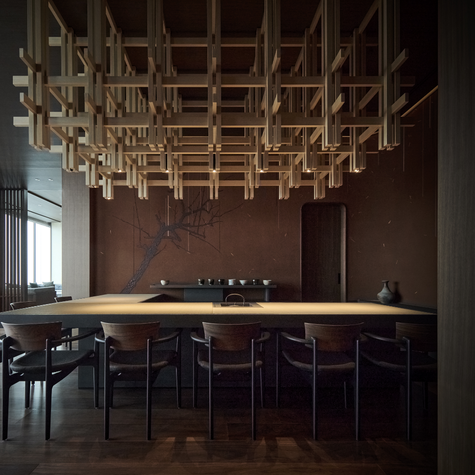 岐阜高山の左官職人、挾土秀平氏によるまるで壁画のような左官壁がゲストを迎える「立礼茶室」は、この地に根づく茶の湯文化に思いを馳せる、中部ならではのおもてなし空間です。