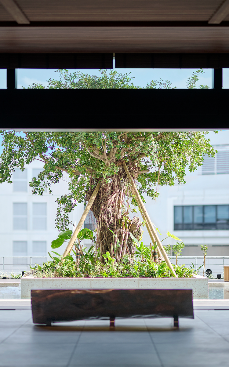芭蕉布のスクリーンの先にはガジュマルが穏やかに佇み、
