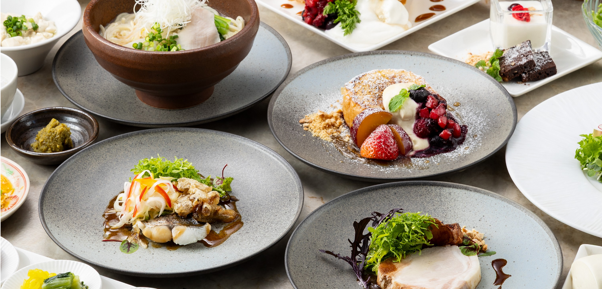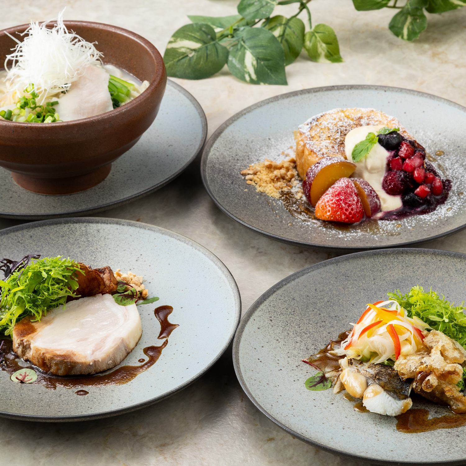 メイン料理は4品をご用意。鹿児島県産茶美豚のポークロティ、鰆のヴァプール、博多水炊き中華そば、ONOフレンチトーストと多彩なラインナップで何度お越しいただいてもお楽しみいただけます。