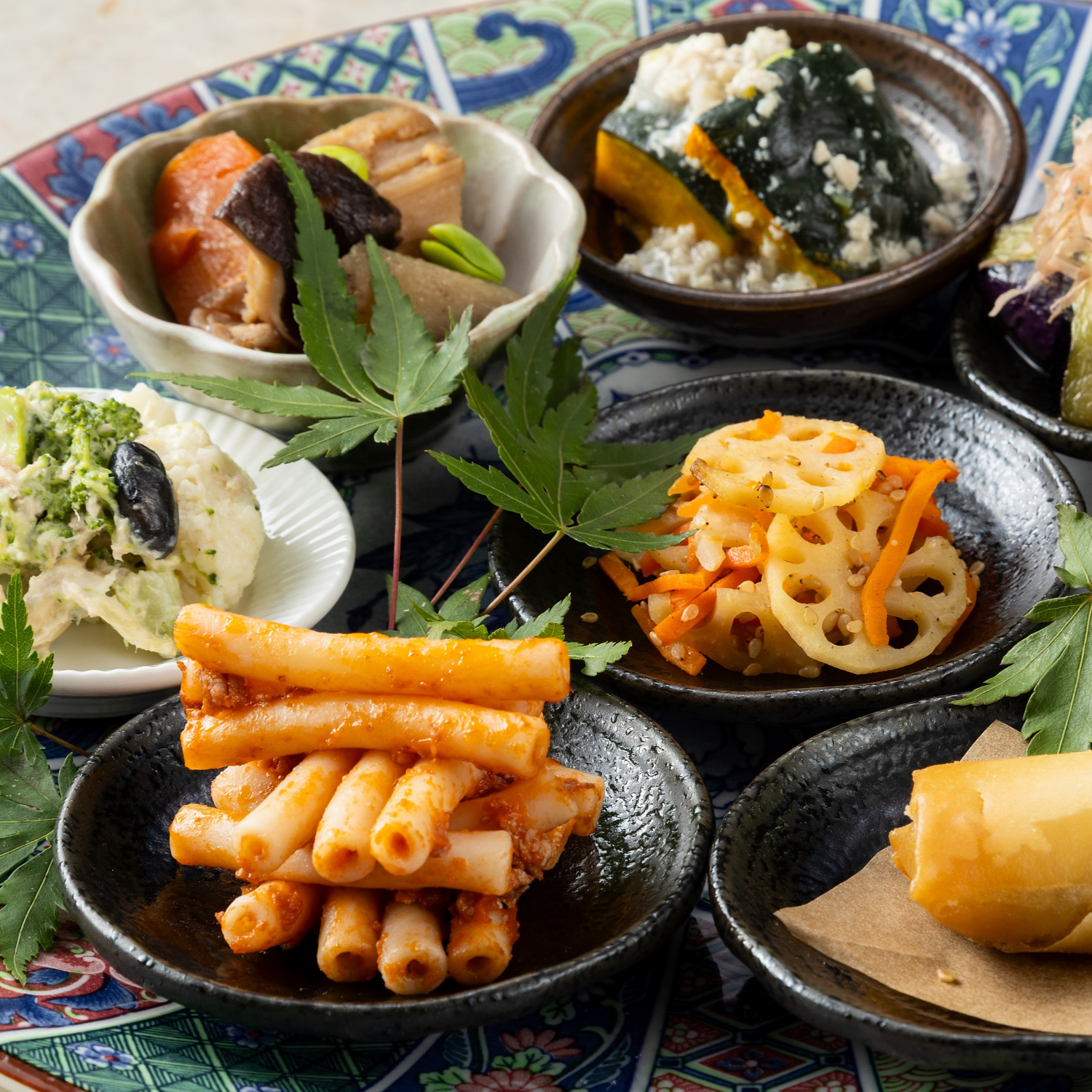 福岡県産ニラと葱のふんわり卵とじ、山椒香る胡瓜と大根の四川風涼菜、博多茄子と茸の香ばしい雑魚和え、長崎名物鯖南蛮タルタルソース、福岡県名物筑前煮など