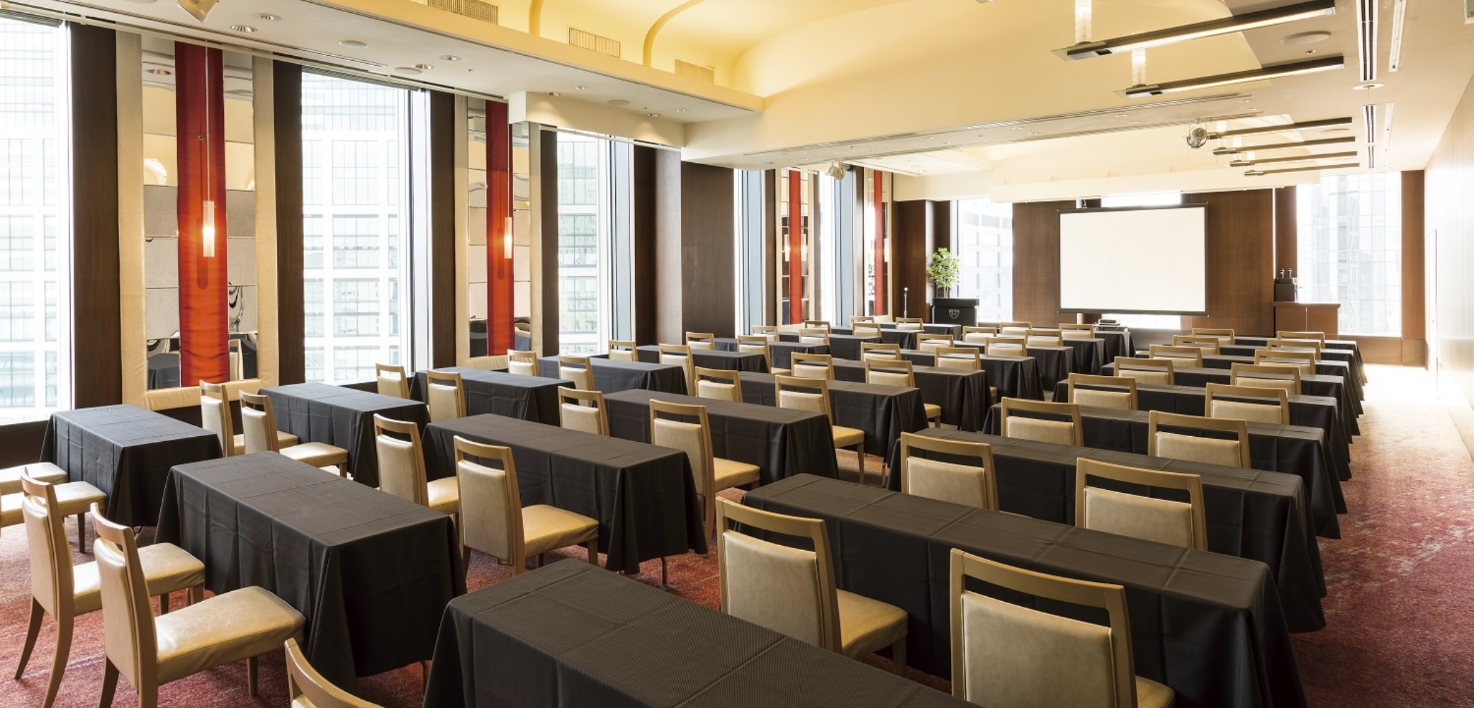 25F宴会場「しおさい」 パーティにもビジネスにも、柔軟に利用できる宴会場。開放感のある大きな窓の外には、浜離宮恩賜庭園の緑やウォーターフロントの風景が広がります。パーティやセミナーなど、用途に合わせたレイアウトに対応します。