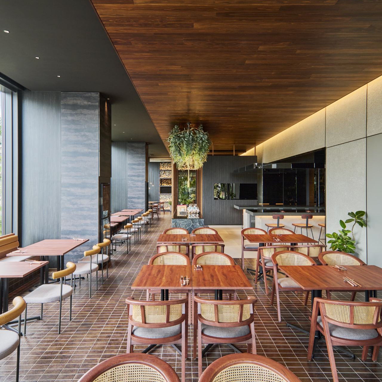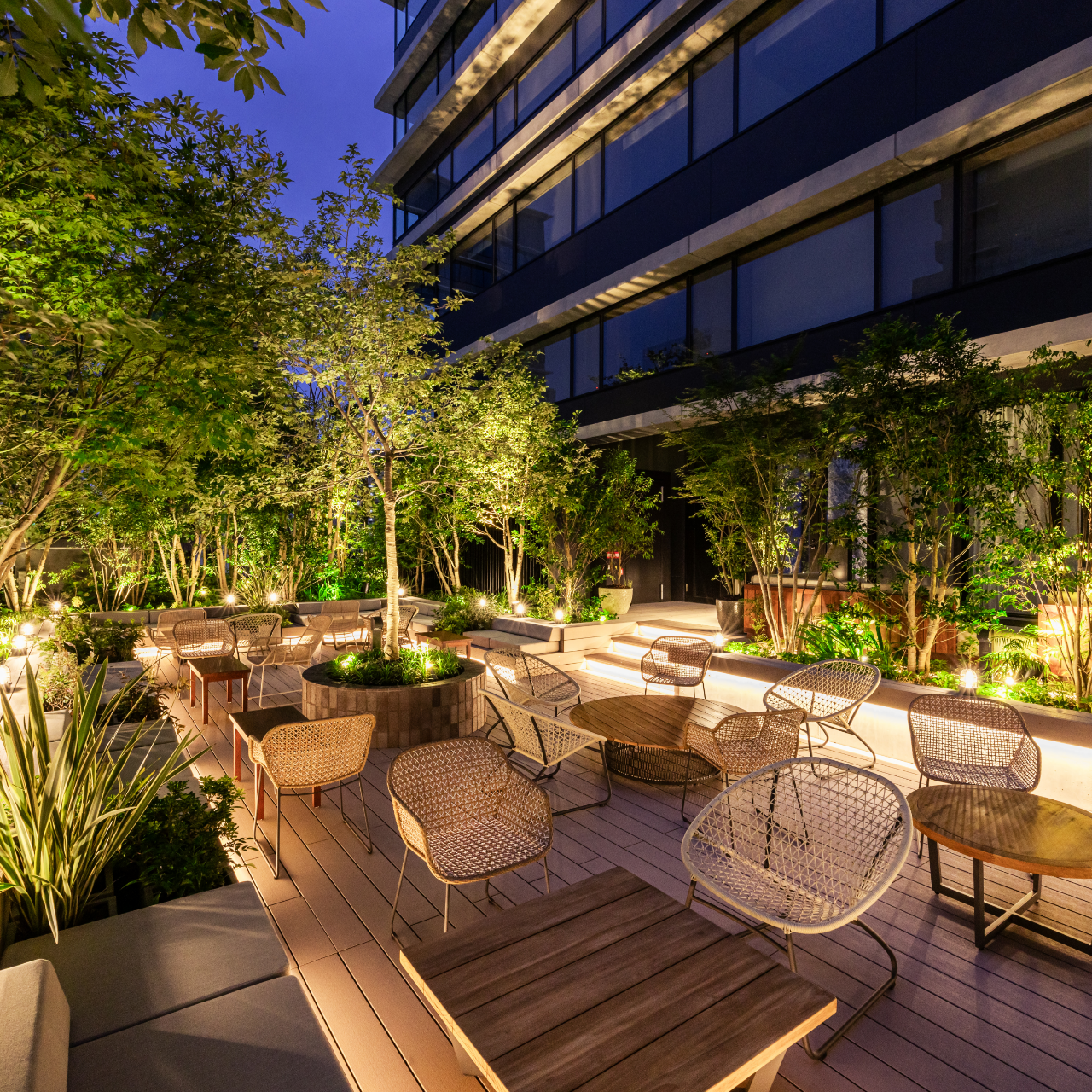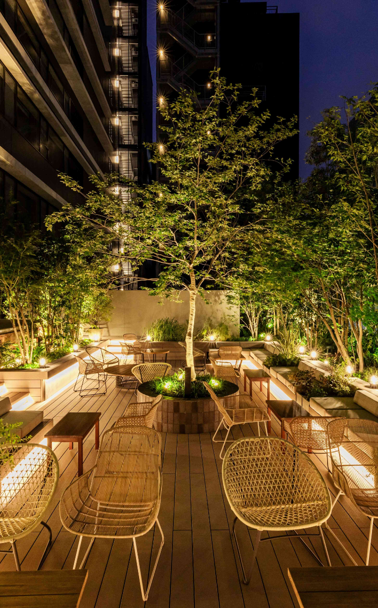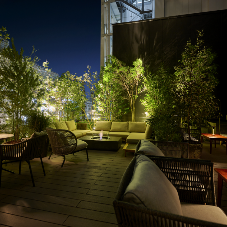 四季折々に変化する木々を配した癒しの空間である、ルーフトップガーデン。福岡中洲という都会にいながら、九州に広く分布する照葉樹林の森“九州の森”の中で涼むような心地よい時間をお過ごしください。
