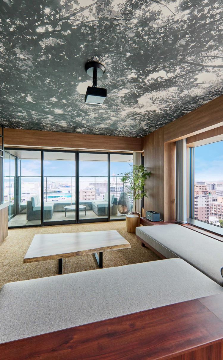 博多川を望むテラス席を併設したキャンバスラウンジ。九州の渓谷をイメージした大浴場にサウナ、Bar KOMOREBI、湯上りラウンジ。さらに“九州の森”をイメージしたルーフトップガーデン……ここが都会であることを忘れる館内施設の数々。キャンバス福岡中洲で心ゆくまでおくつろぎください。