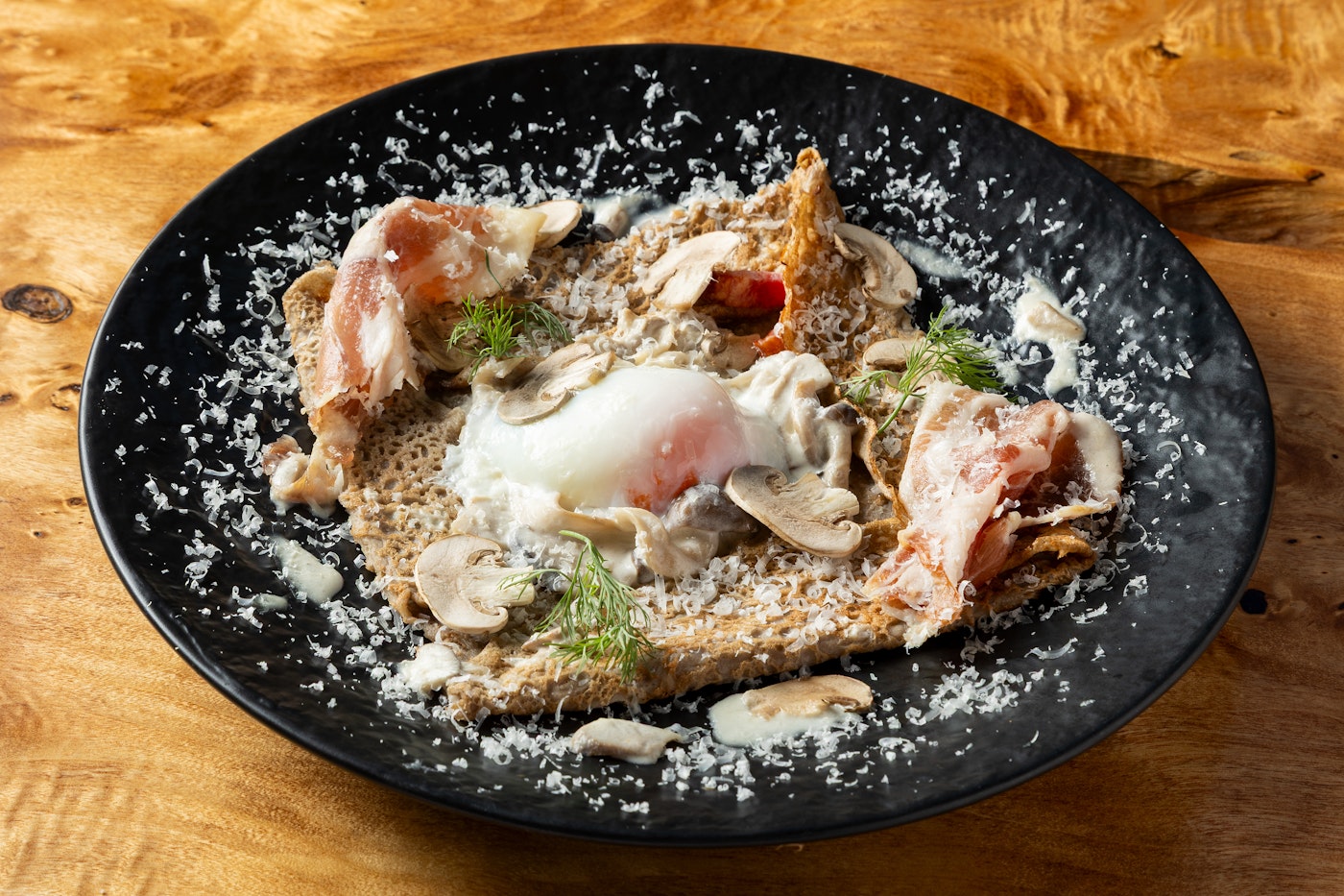 香ばしいベーコンと生ハムの旨みを、マッシュルームの風味とカッテージチーズの優しい酸味が包み込む、塩味の中にまろやかさと深みが広がる風味豊かなガレットです。