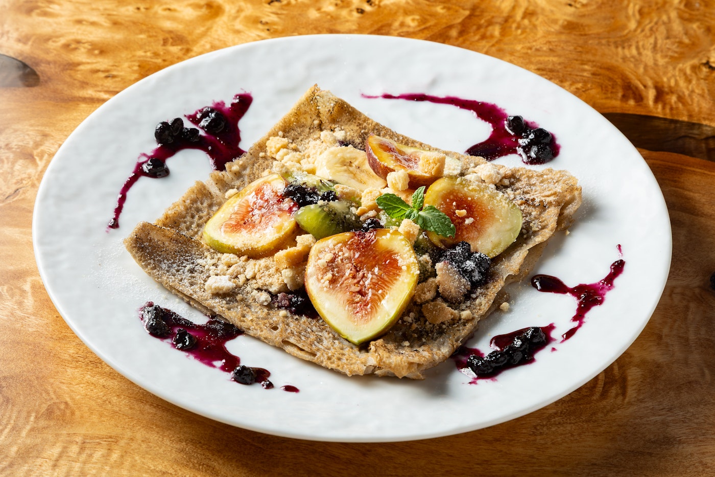 季節の果実をふんだんにのせた、唯一のスイーツガレット。いちじく、キウイ、バナナの自然な甘みと酸味に、ワイルドブルーベリーソースを添えた華やかなガレットです。