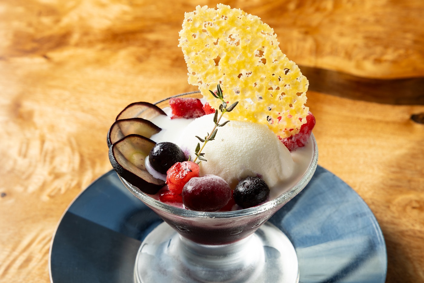 赤葡萄のジュレ/梨 パルメザンのチュイール/ミルクジェラート