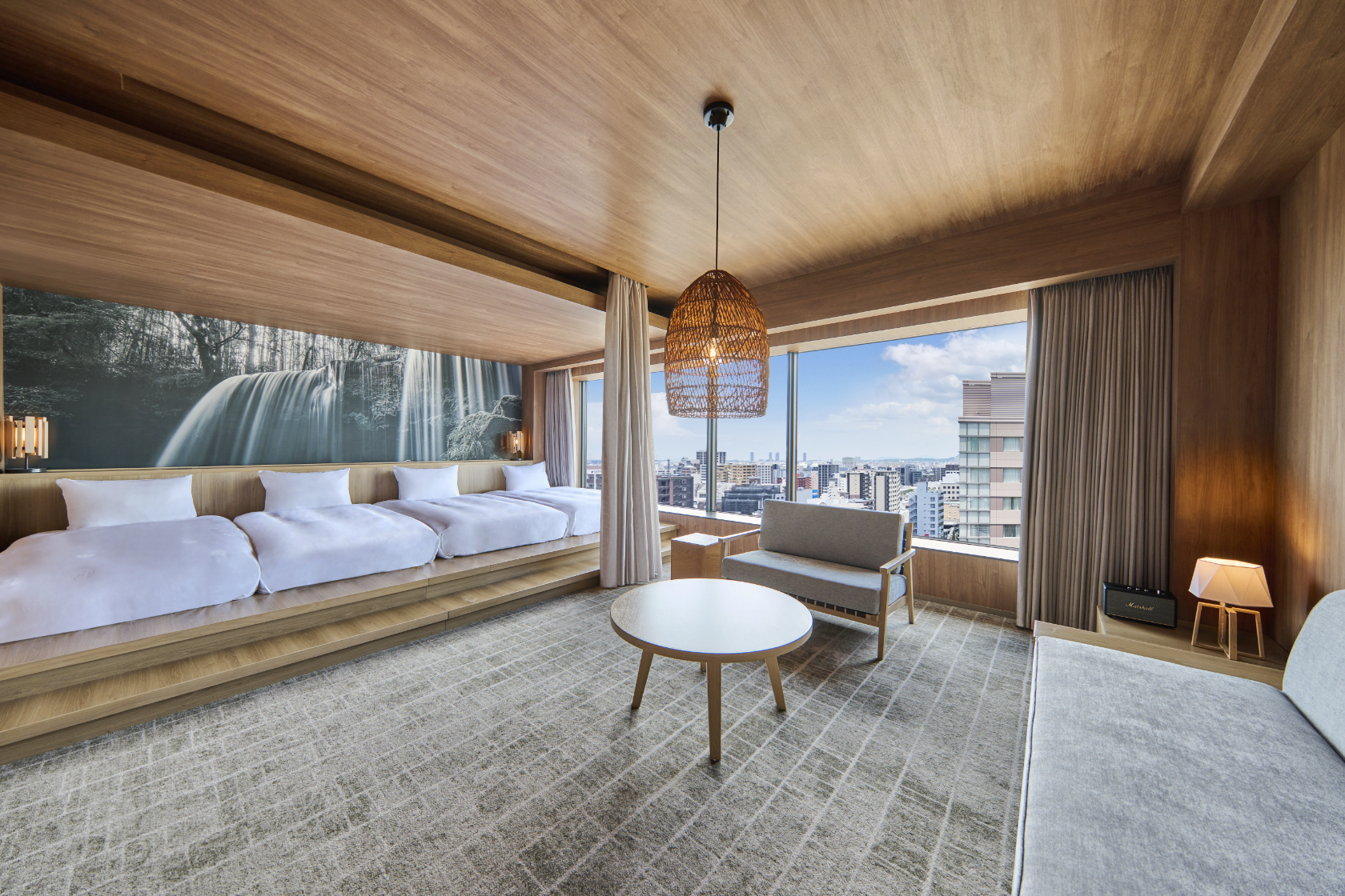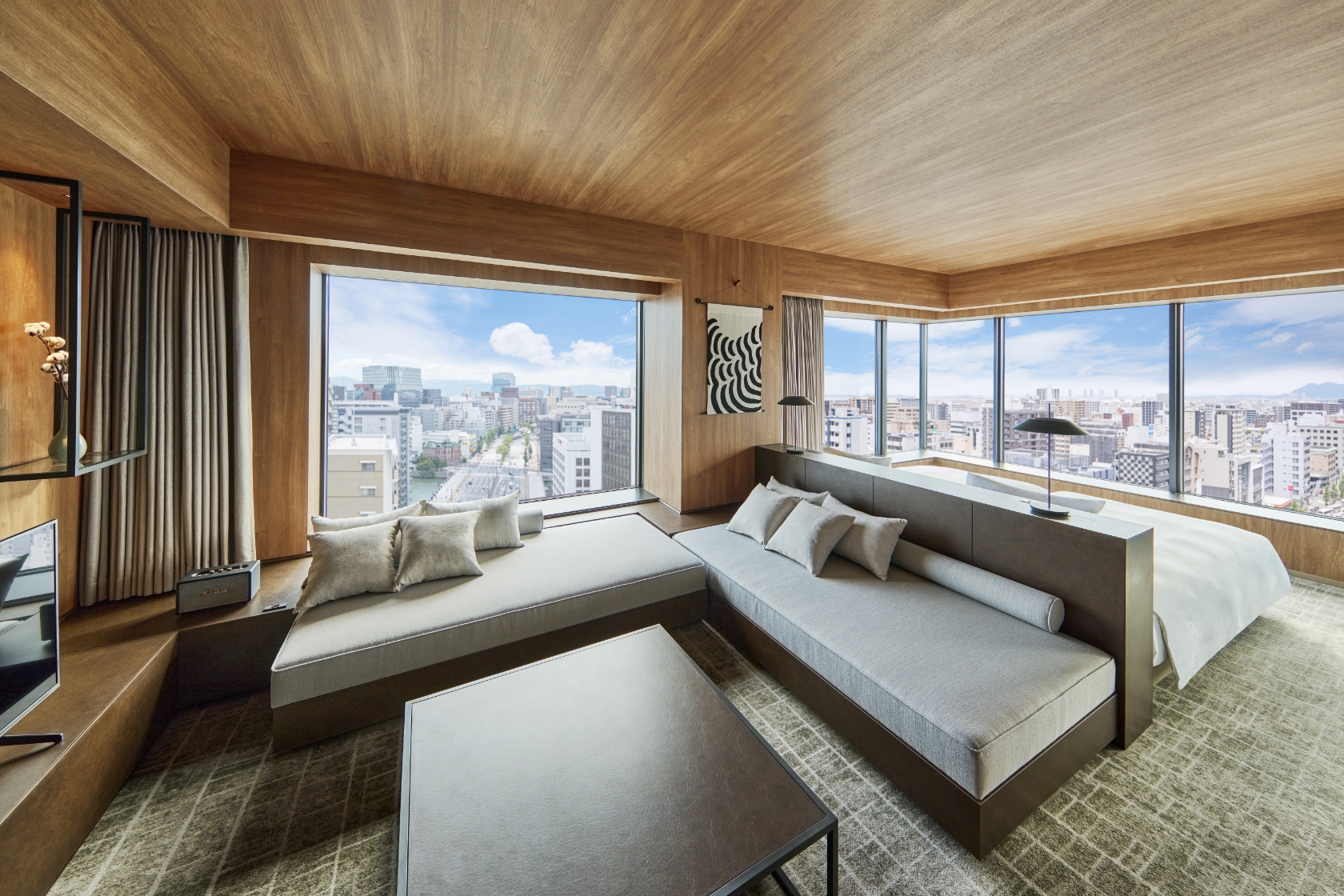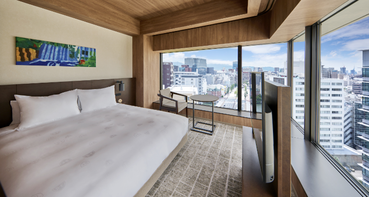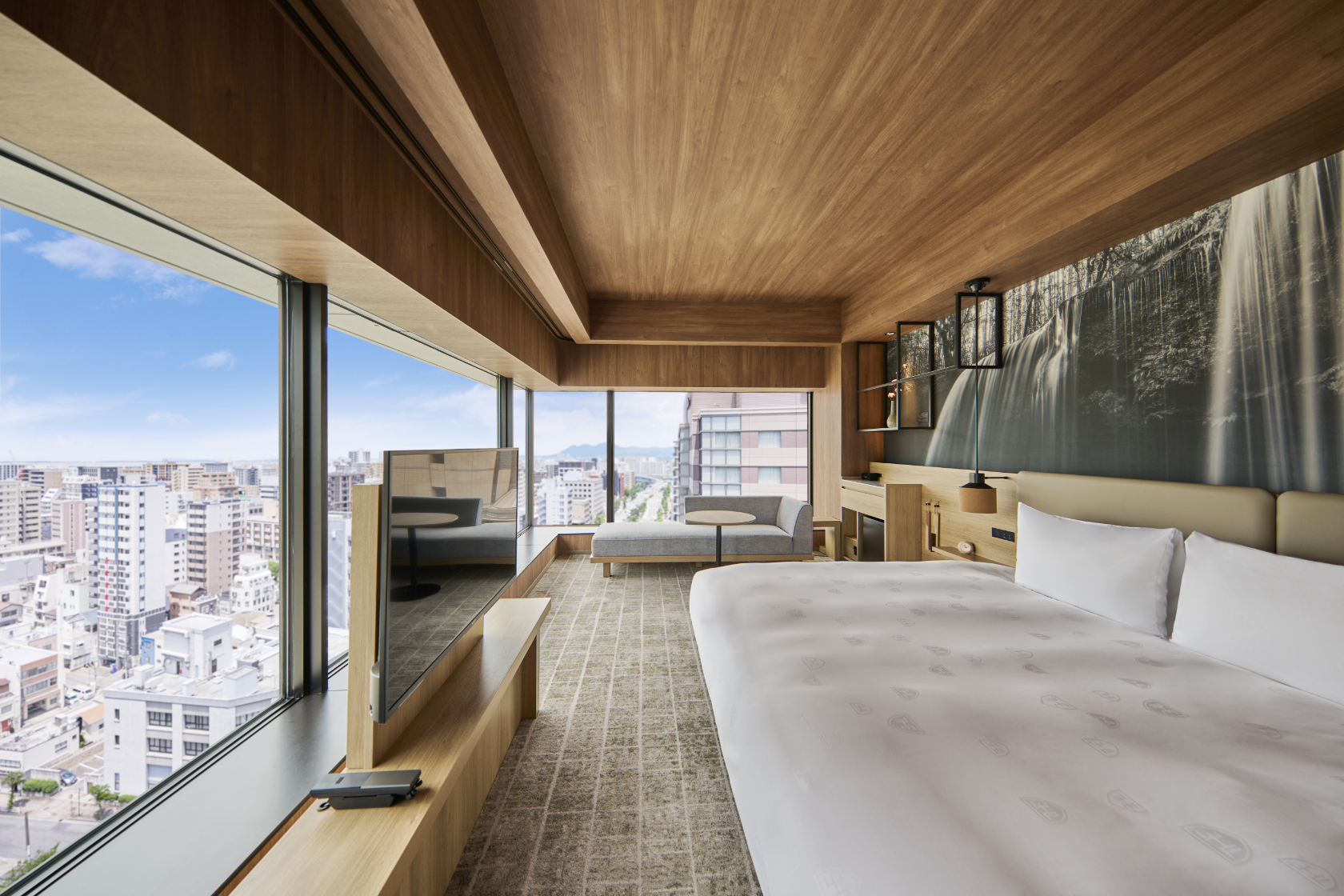 リバーサイドのお部屋は、眼下に望む博多川のゆったりした流れを眺めながら過ごせる。さらに最上階14Fにはバルコニーやビューバスが付いたスイートも。