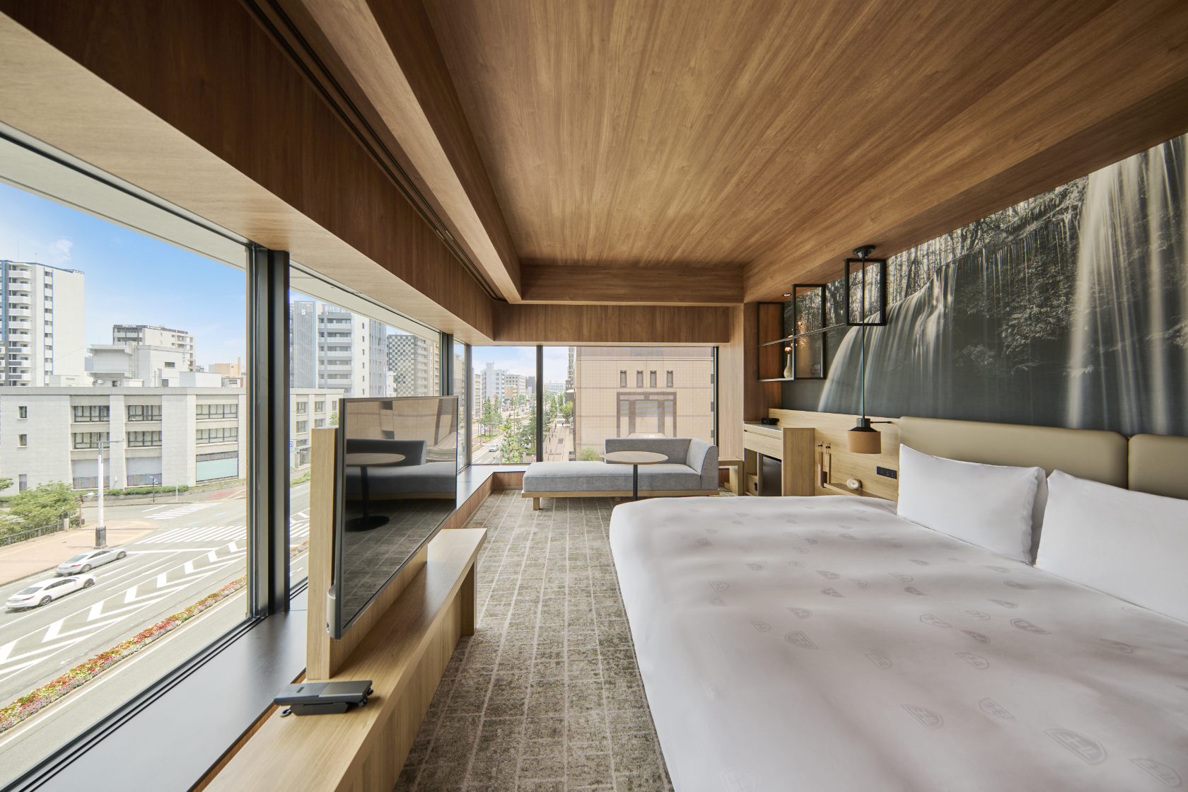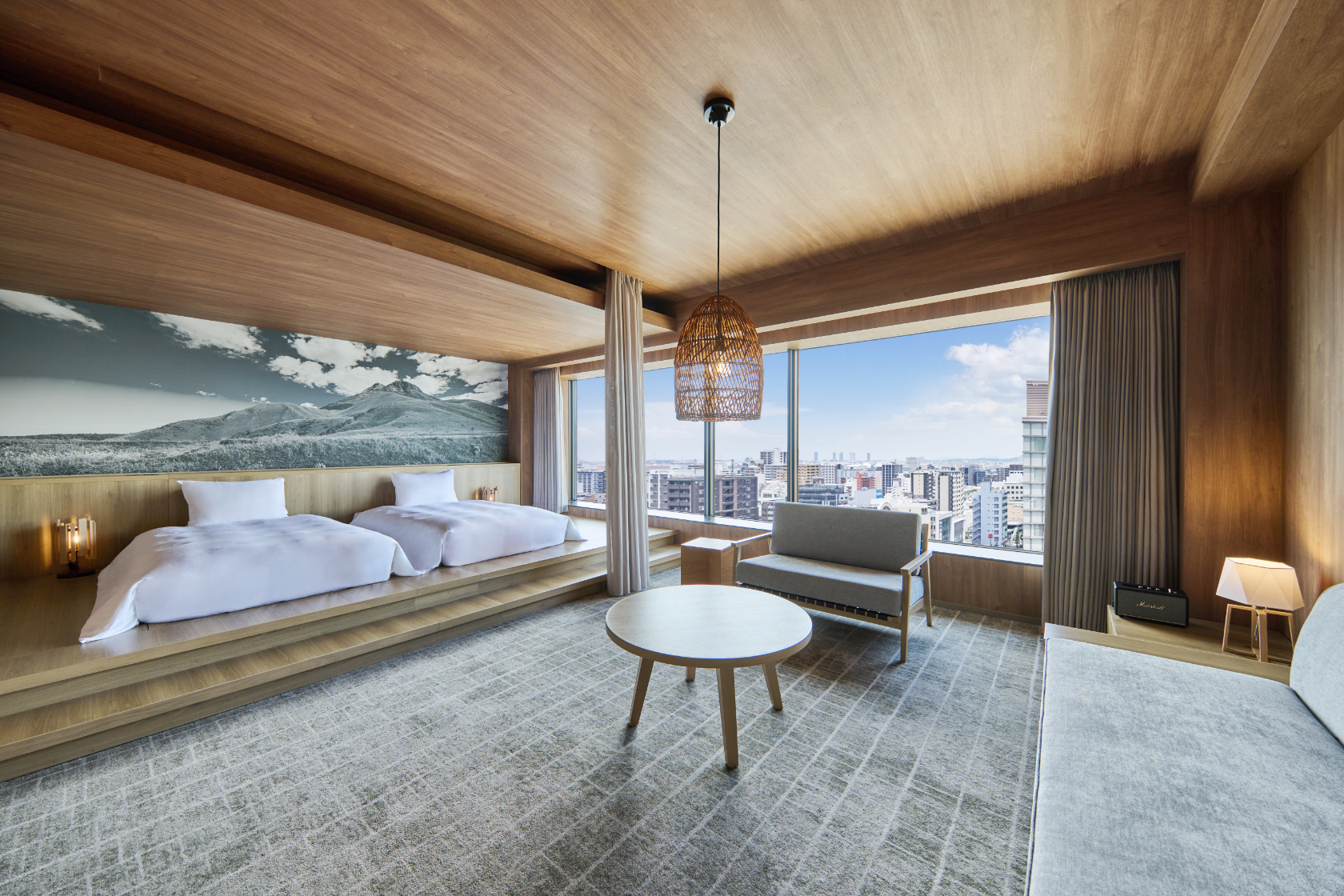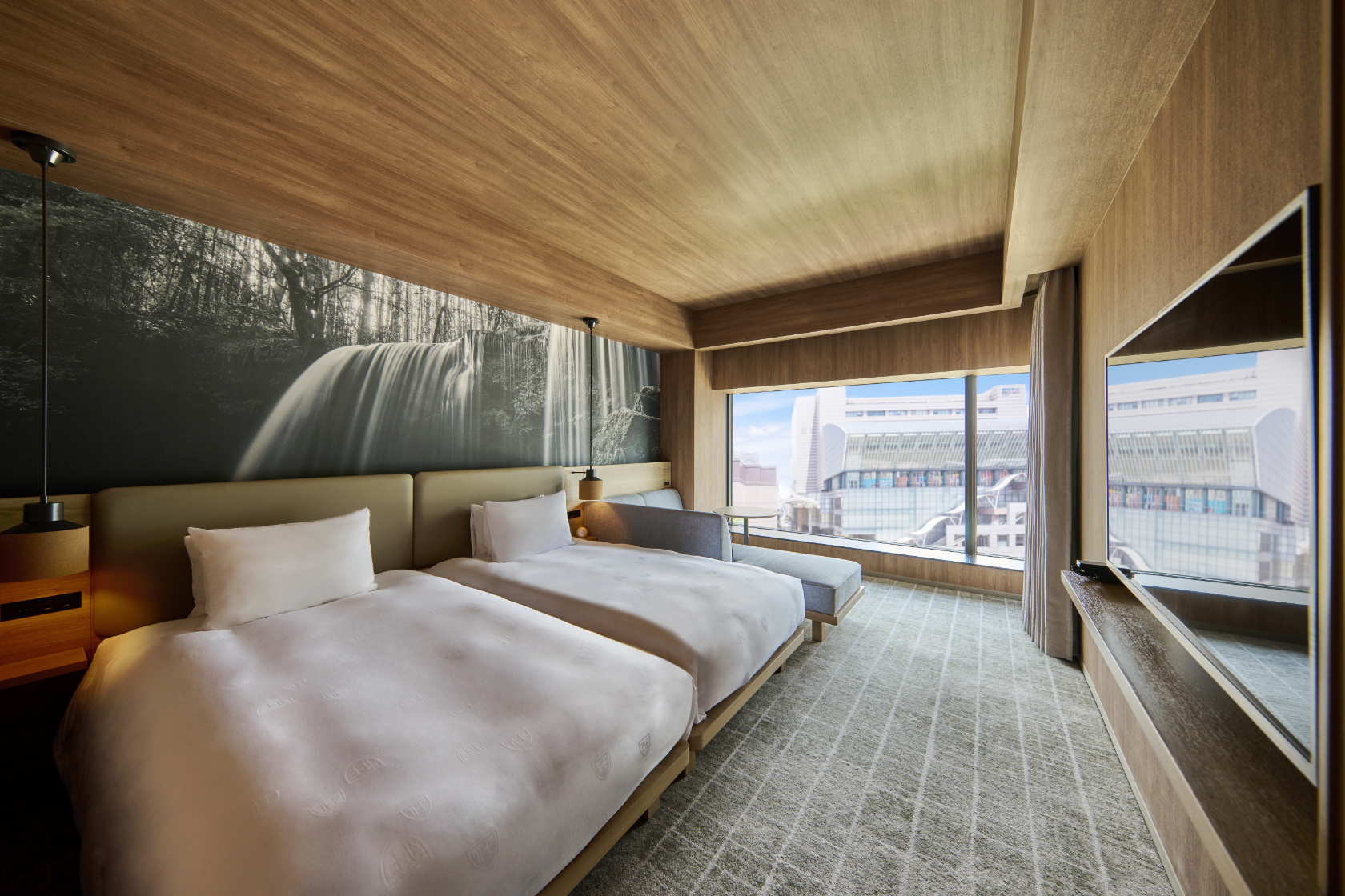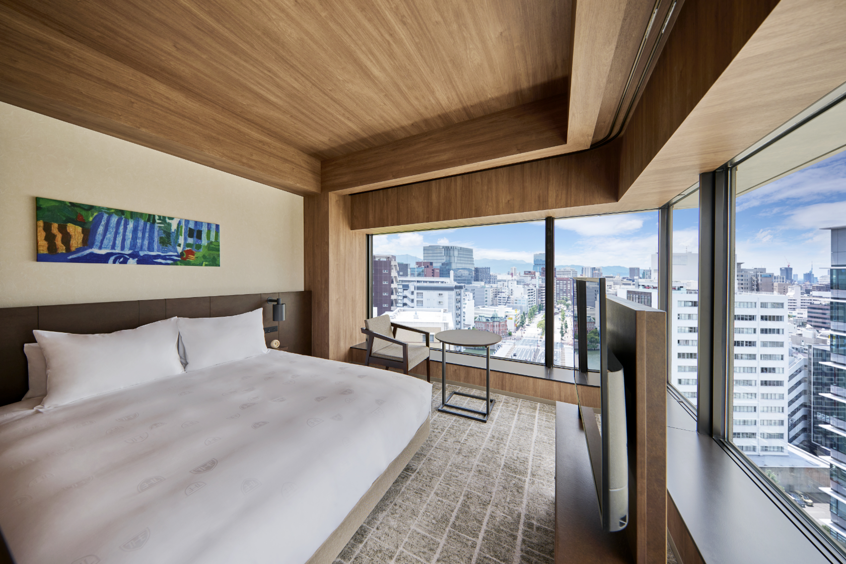 リバーサイドのお部屋は、眼下に望む博多川のゆったりした流れを眺めながら過ごせる。さらに最上階14Fにはバルコニーやビューバスが付いたスイートも。