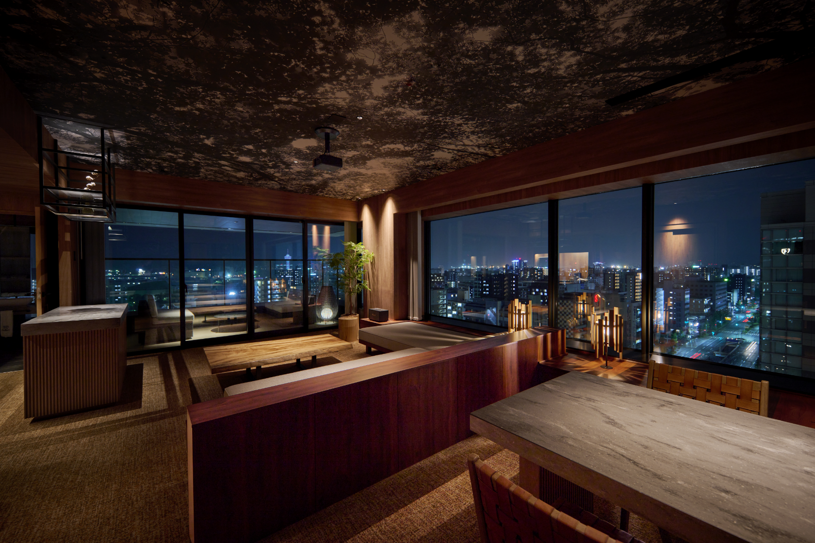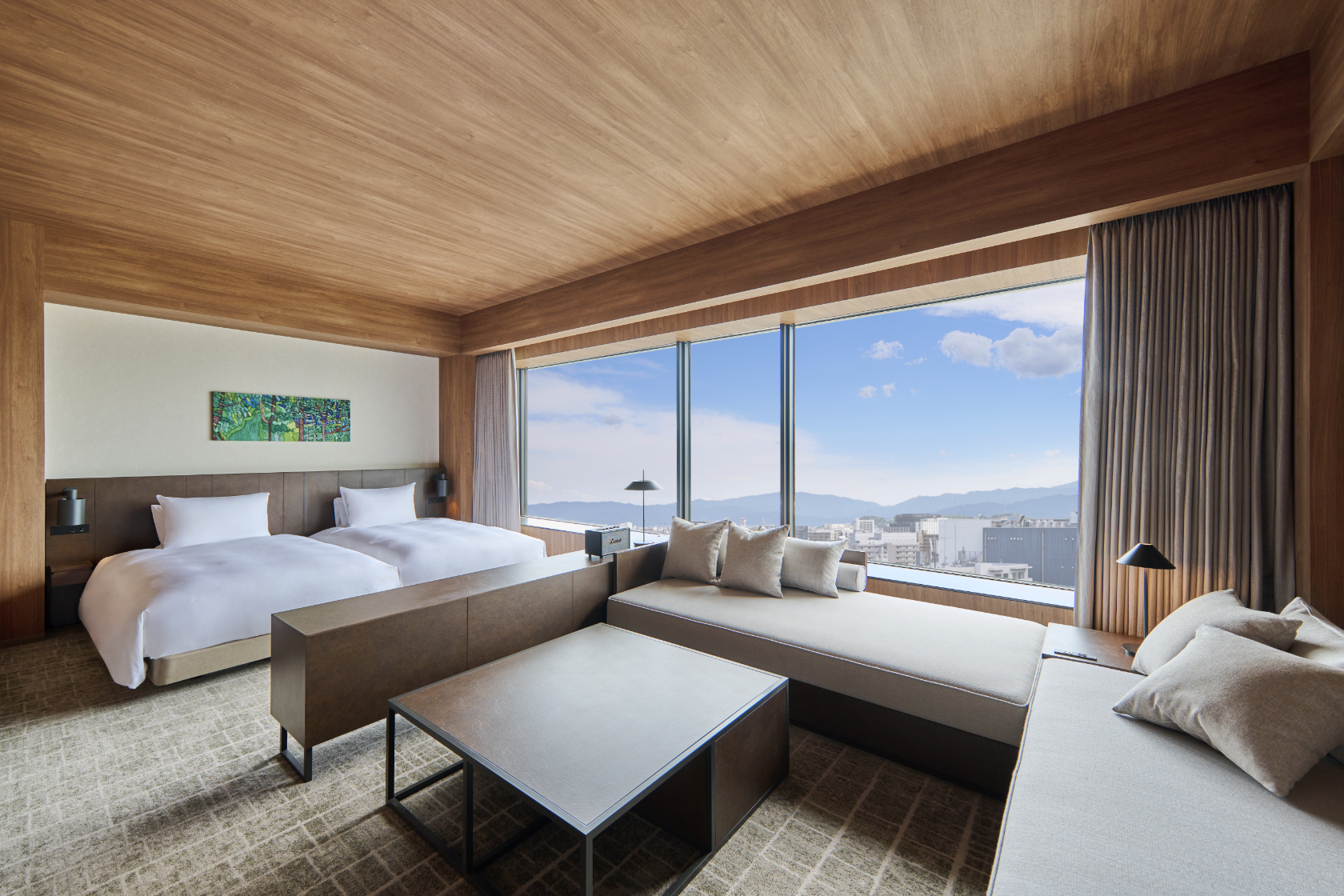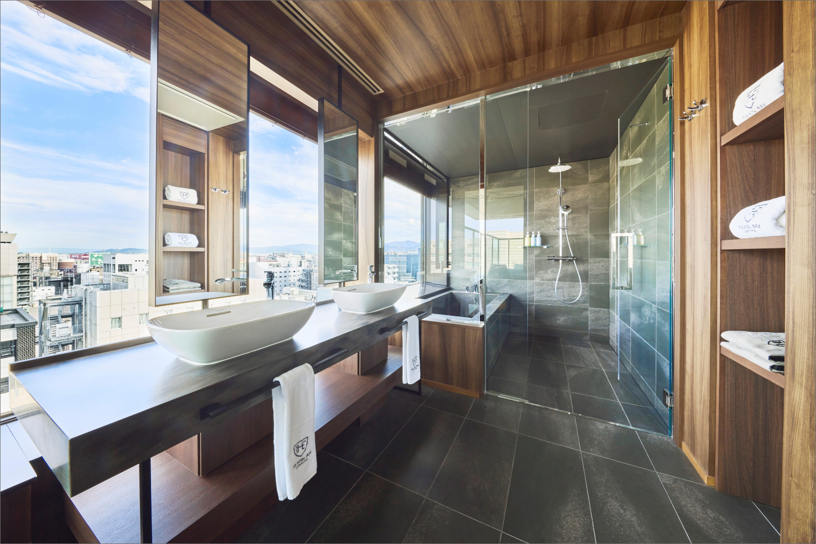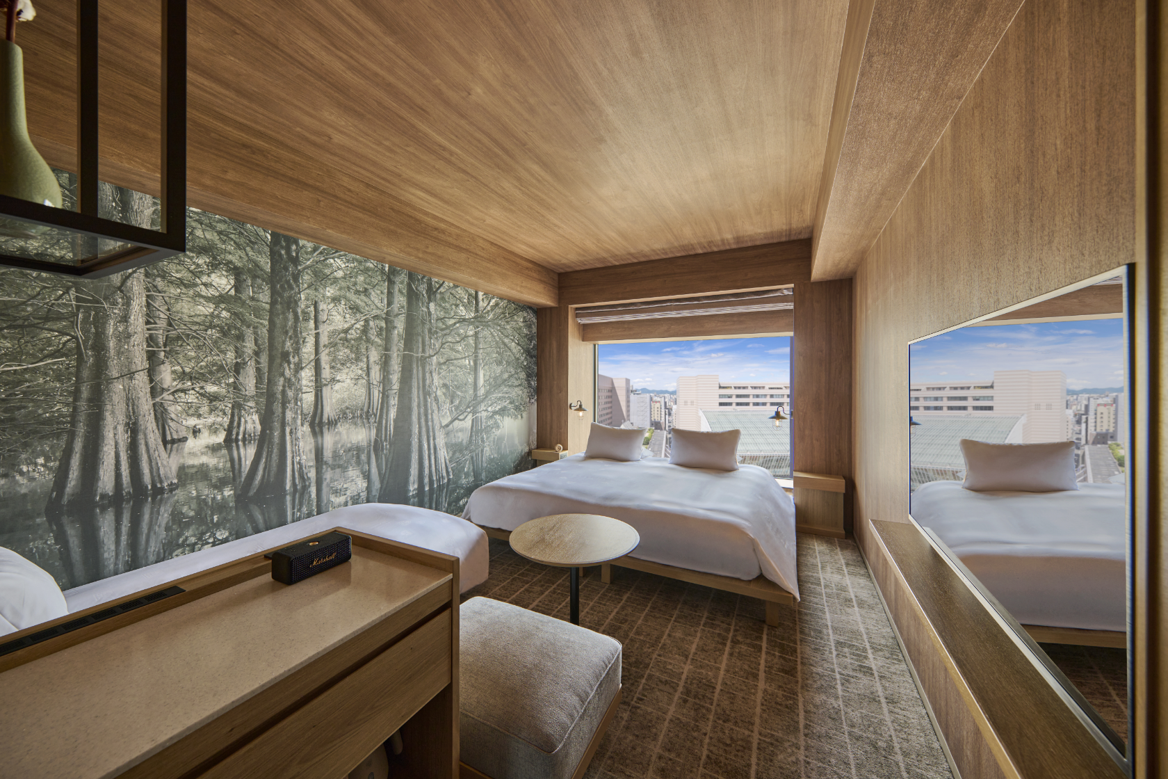 リバーサイドのお部屋は、眼下に望む博多川のゆったりした流れを眺めながら過ごせる。さらに最上階14Fにはバルコニーやビューバスが付いたスイートも。