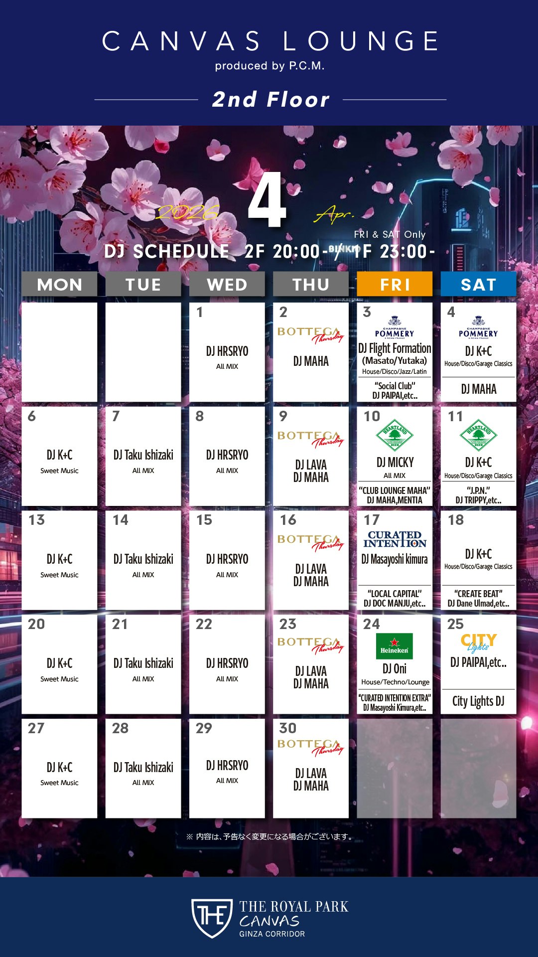 Canvas Lounge on The 2nd Floor DJイベント コアタイム 20:00~23:00※イベント内容は予告なく変更になる場合がございます。