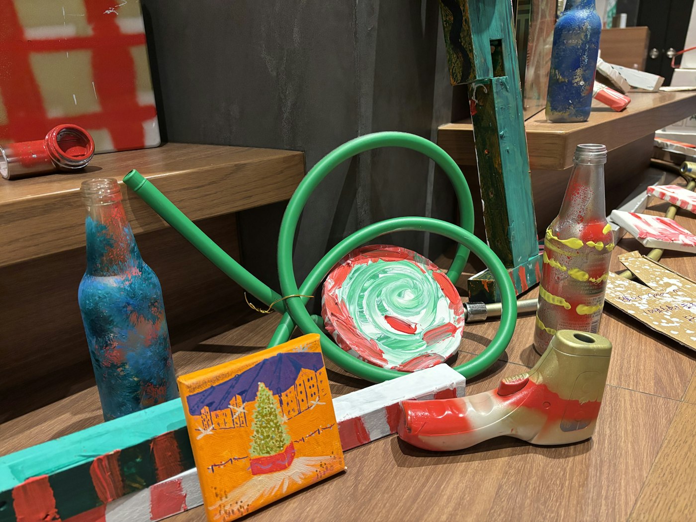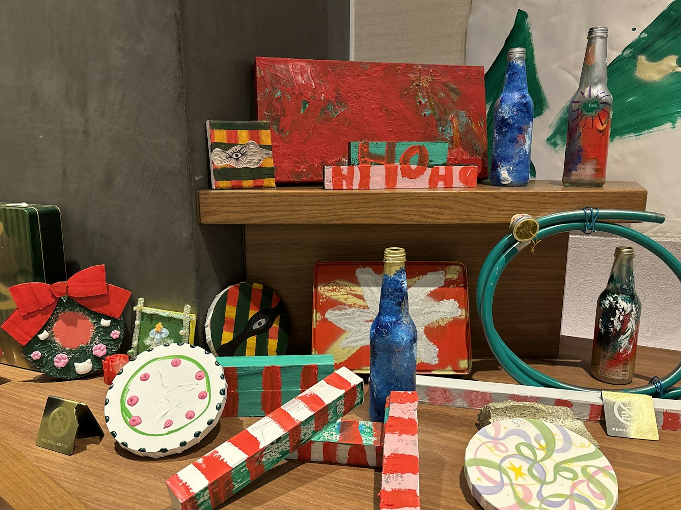 壁面にはキャンバスを再利用して描いたツリーも。