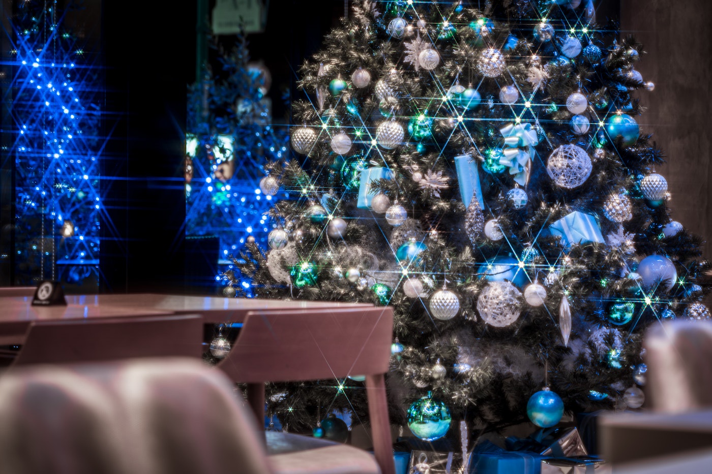ブルーグリーンのクリスマスツリーで彩られたラウンジで、この季節だけの心躍るティータイムをお過ごしください。
