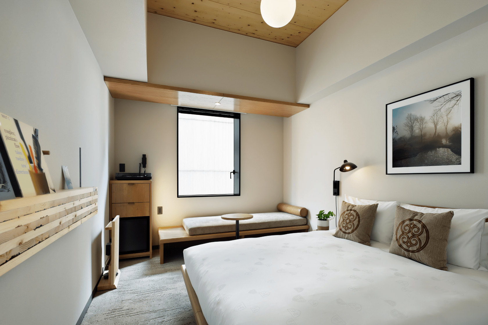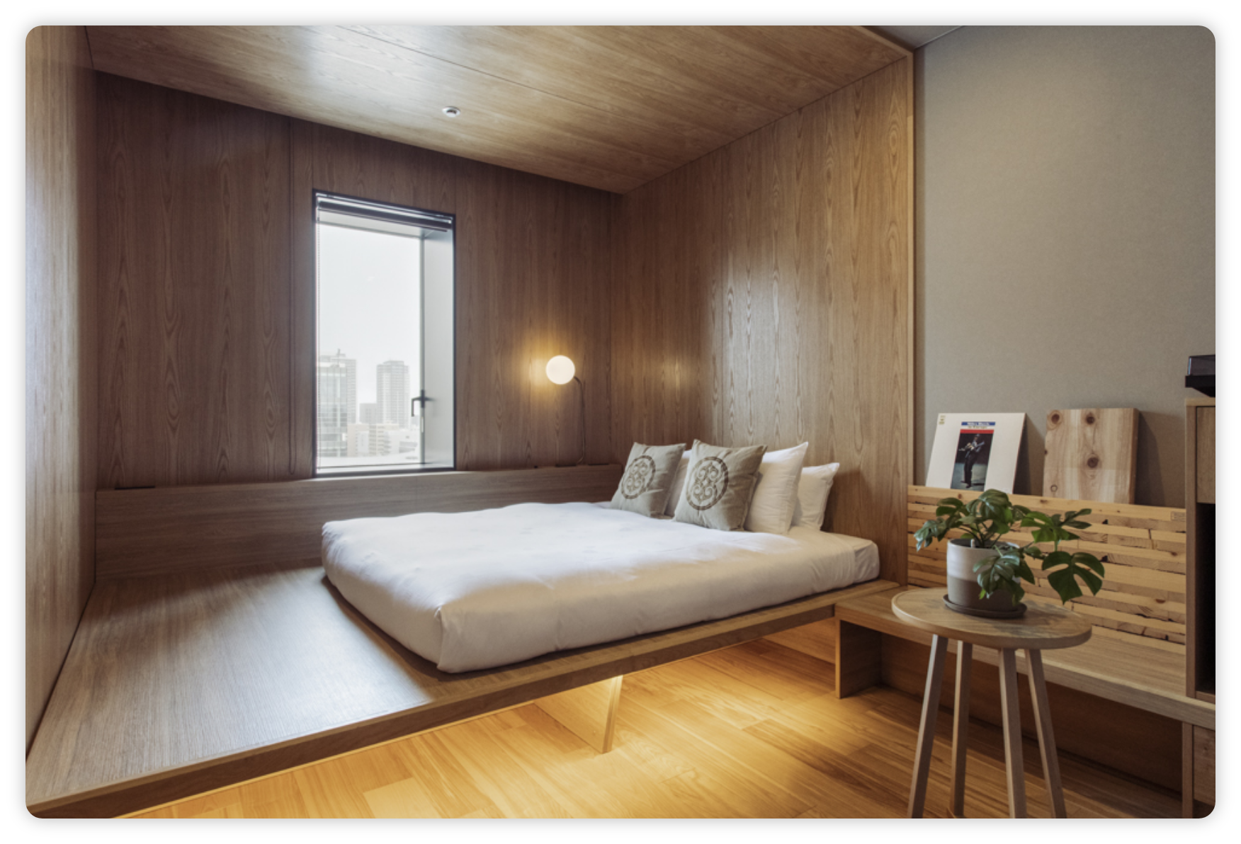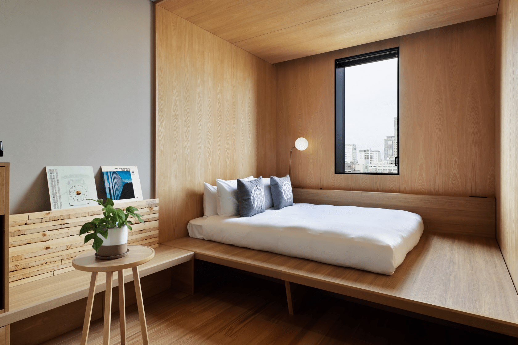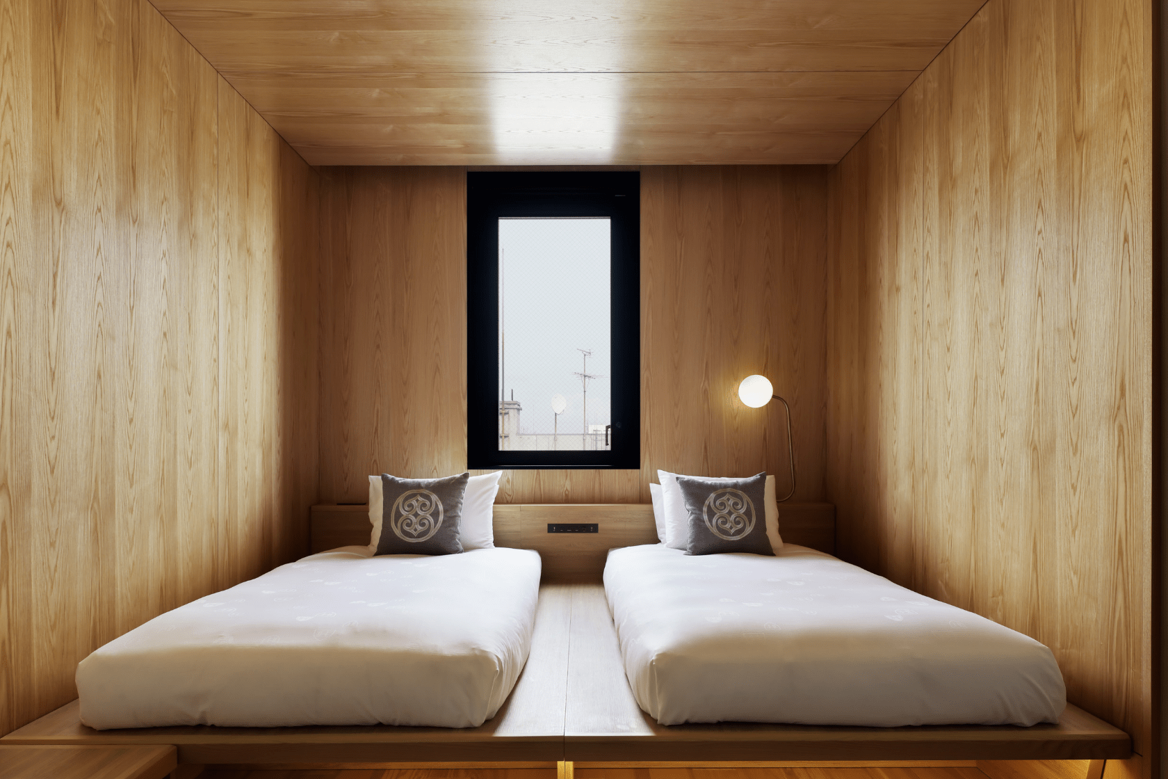 木材に囲まれたベッドスペースは、山の中のキャビンで過ごしているかのよう。