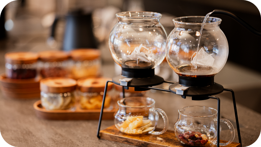 "Tea drip" where you can choose from 3 types of tea leaves and dried fruits to drip Black Tea. Discover your favorite combination of tea leaves and fruits.