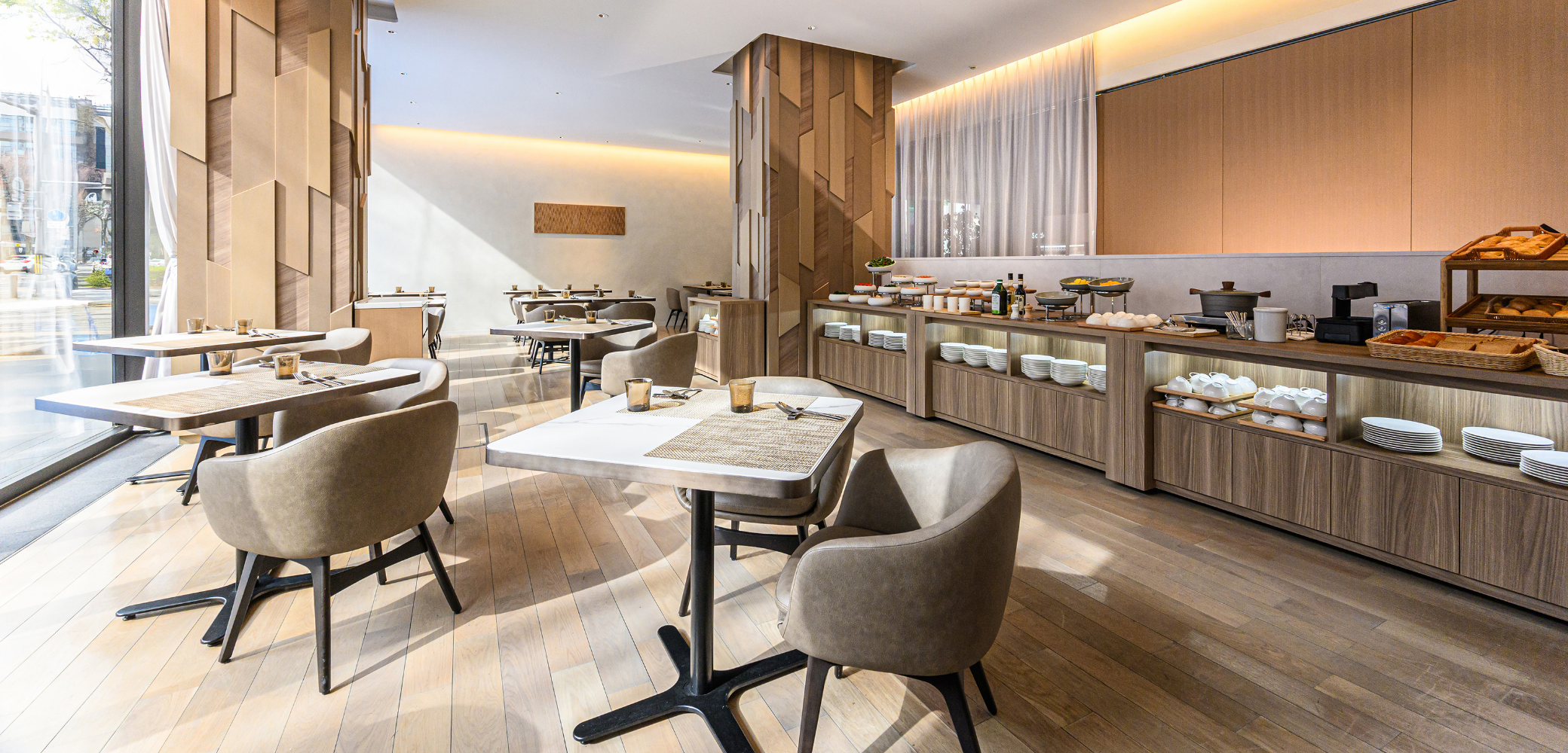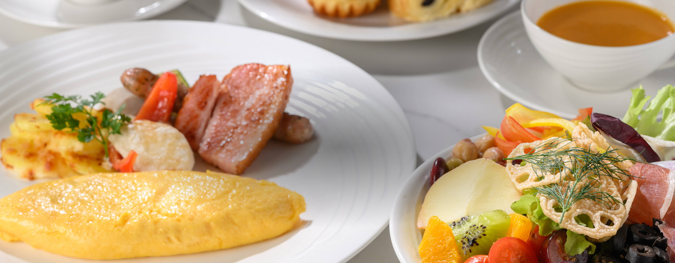 The morning sunlight pours in softly through the large glass windows of this restaurant. Enjoy our "Wellness Salad," which includes grilled dishes such as eggs and bacon, as well as colorful vegetables and fruits, and toppings that add nutritional value.