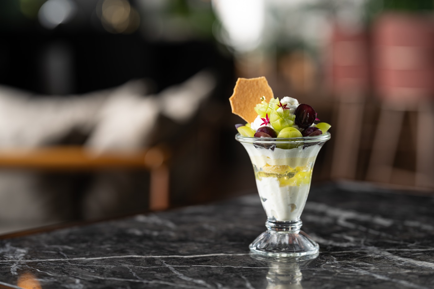 みずみずしいマスカットのジュレと、華やかなエルダーフラワーの香り、濃厚な巨峰アイスが重なり合い、果実感あふれるパフェに仕上げました。