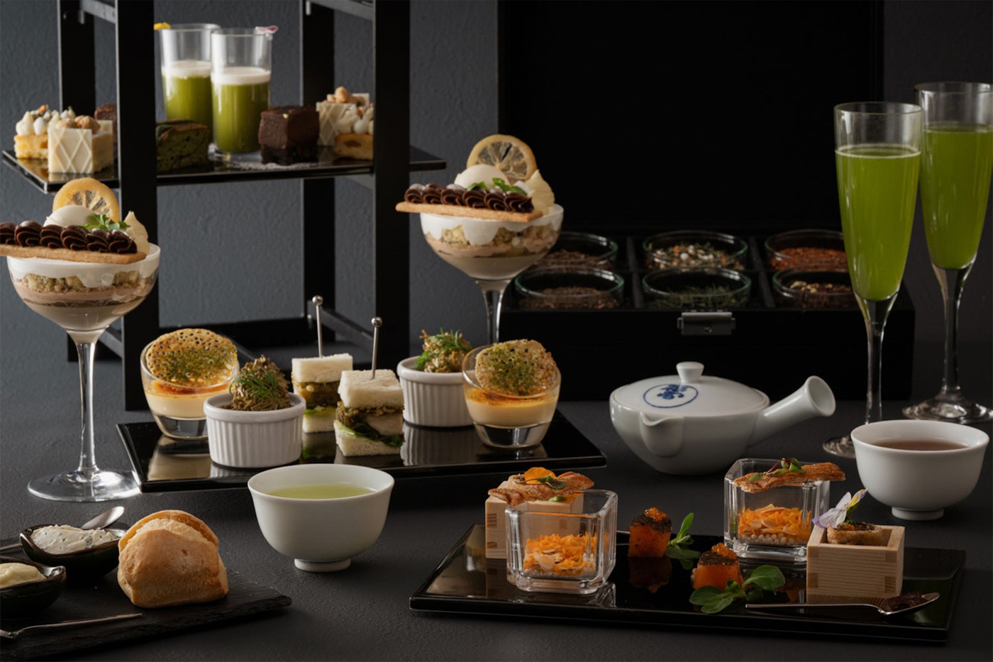 1717年(享保2年)創業、京都に本店を構える日本茶専門店「一保堂茶舖」の 玉露やほうじ茶、和紅茶などを随所に取り入れ、それぞれの香りと旨みを丁寧に引き出しました。和の食材をフレンチの技法で仕立てたスイーツとセイボリーにお茶の奥行きある味わいを重ね、初夏の情景を五感で楽しむひとときを演出します。