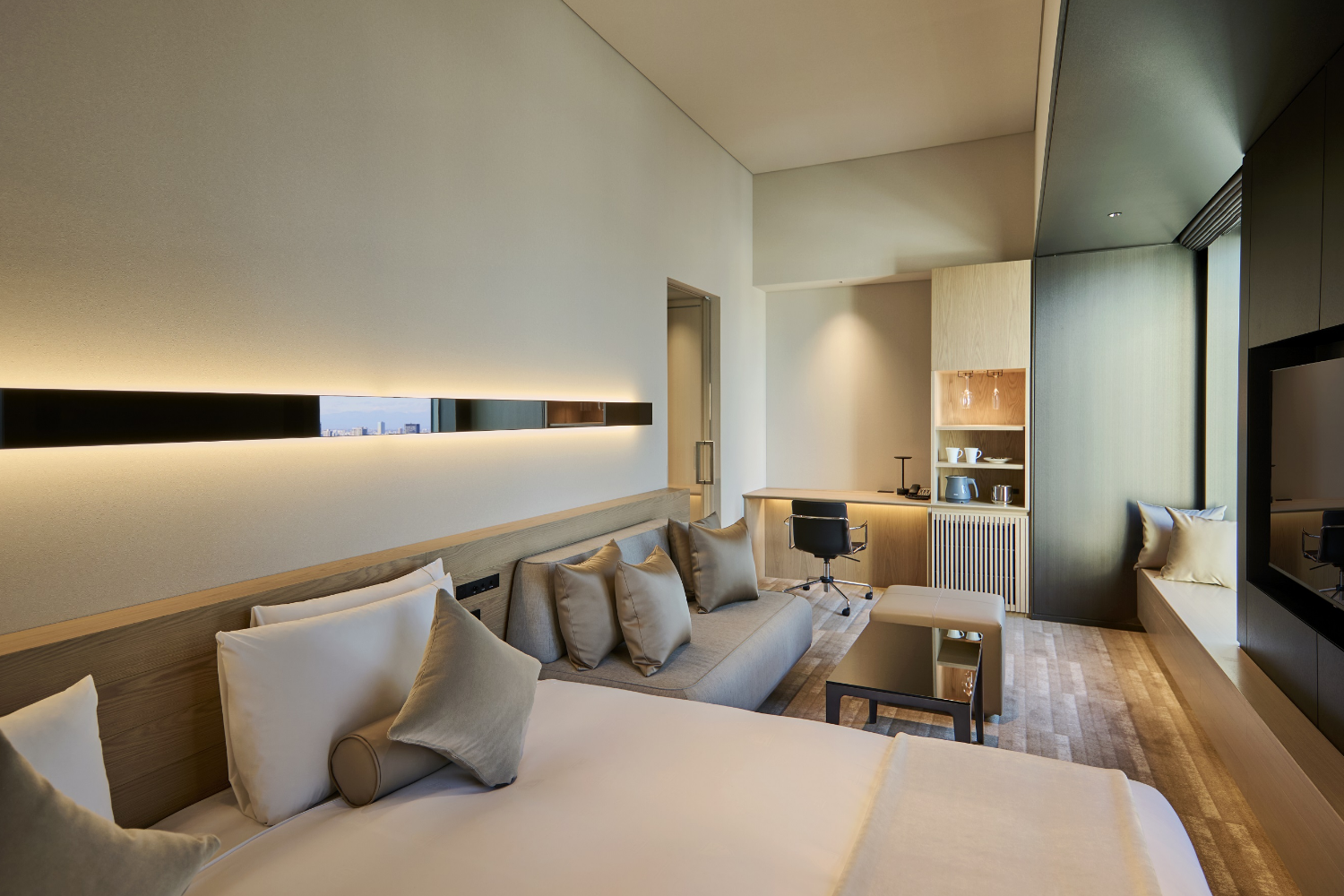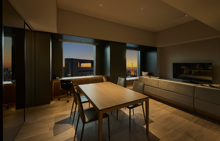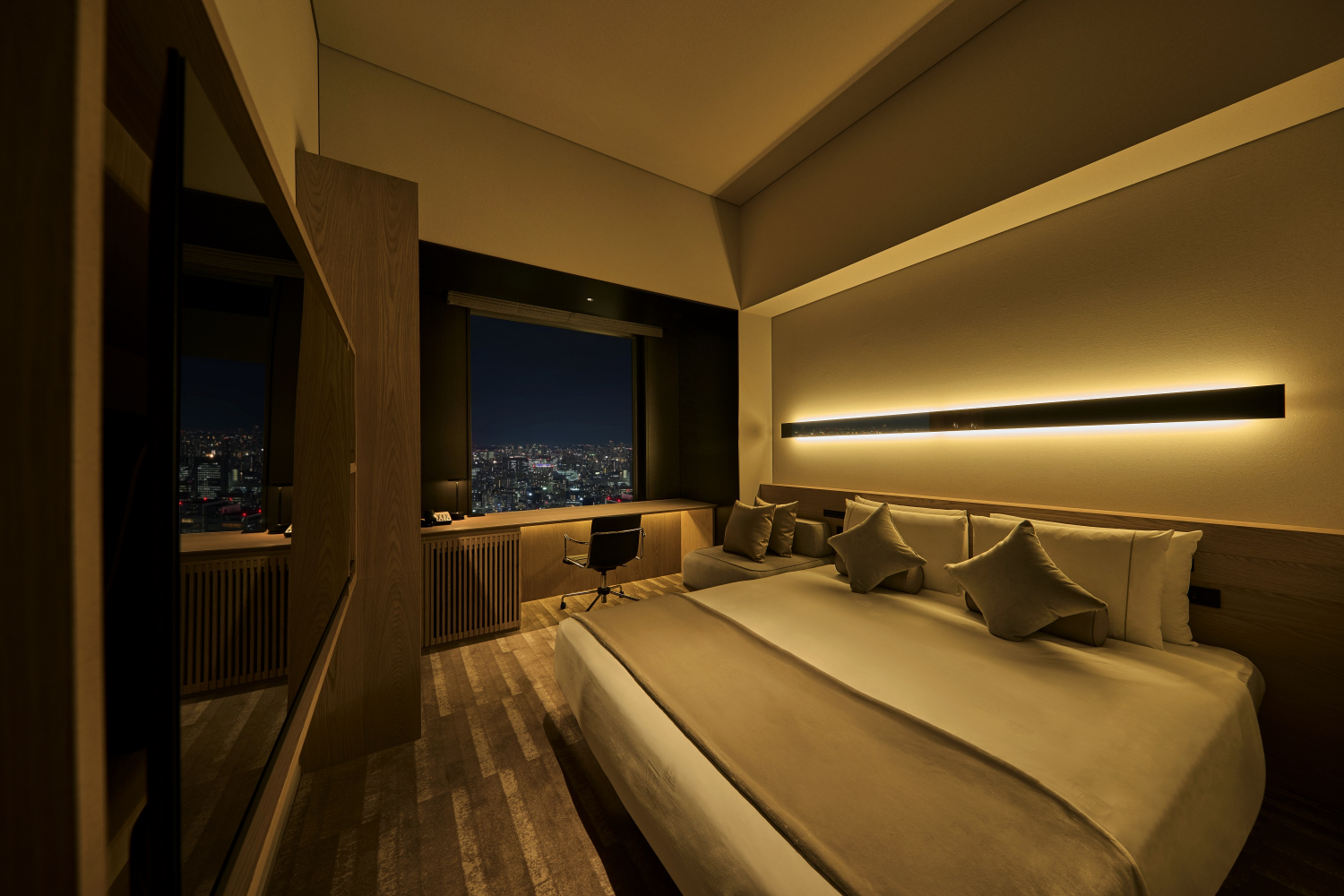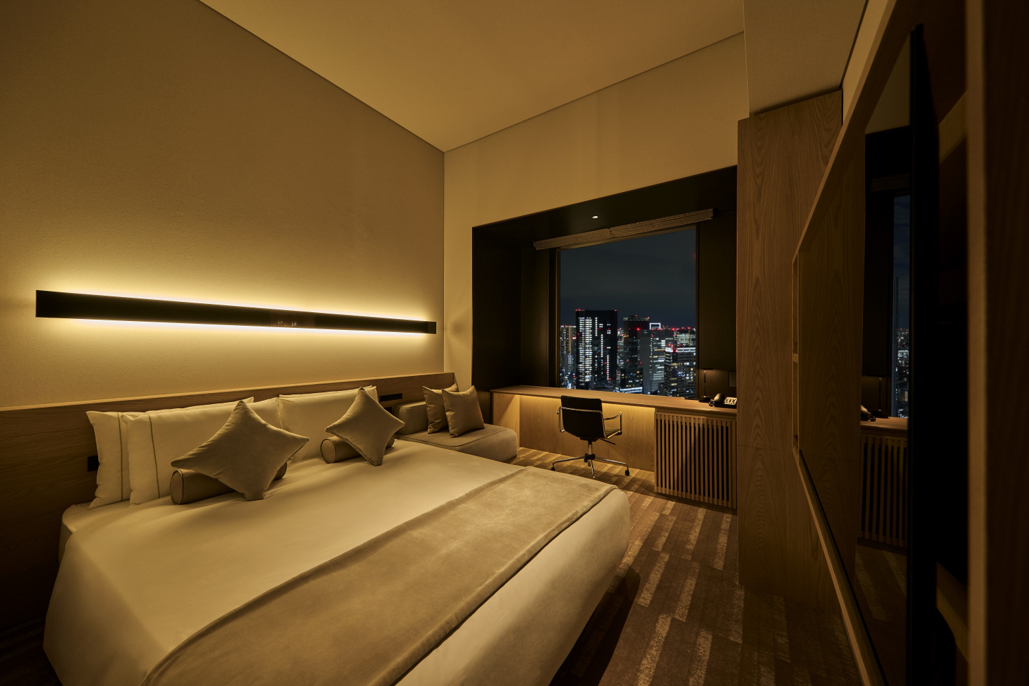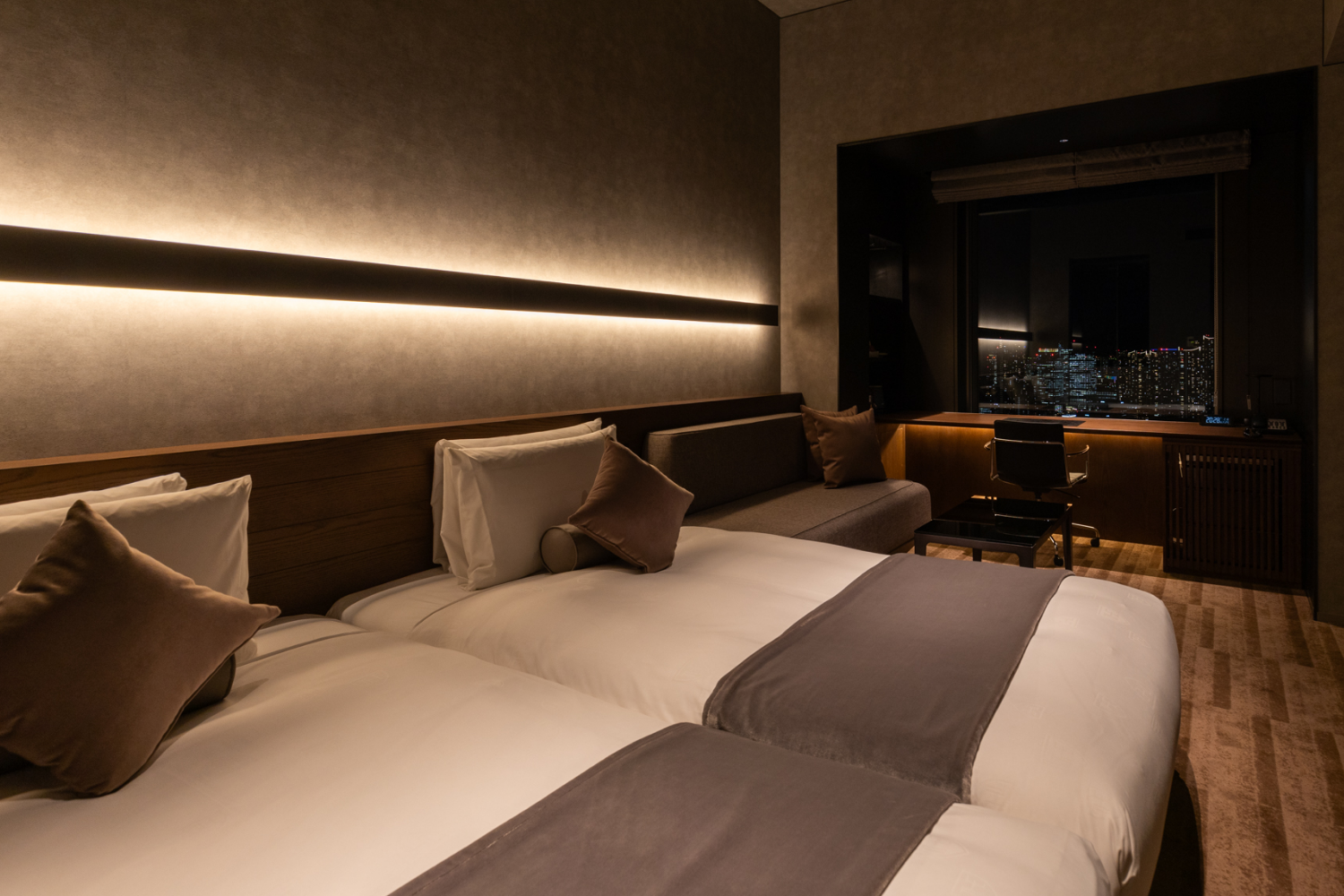 The guest rooms capture the view of the glittering skyscrapers at night, and the design incorporates the image of ending the day amidst that night view.