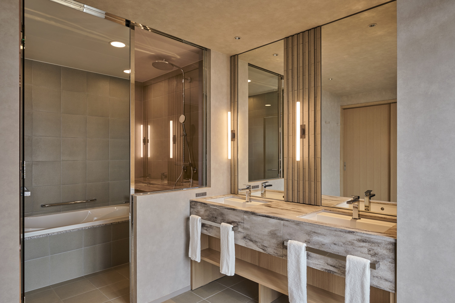 書斎をイメージしたモノトーンな色調のミニマリズムなデザインで、バスルームからも眺望が楽しめるように設計されています。