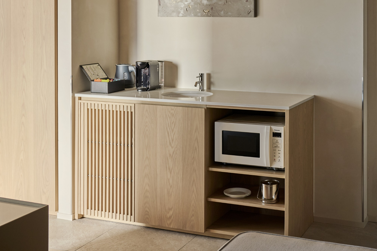 移りゆく景色をゆったりとお楽しみいただけます。大きなクローゼットやバスルーム、ダイニングテーブルとキチネットもあり、「暮らすように滞在する」ことができます。
