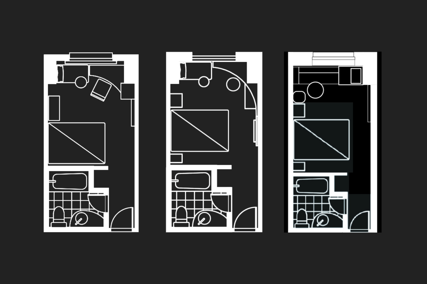 A room with a spacious bathroom.