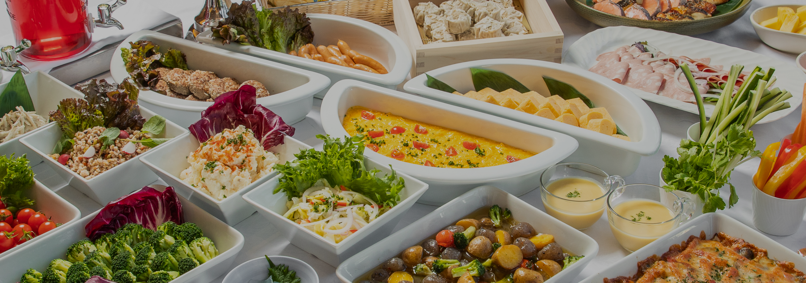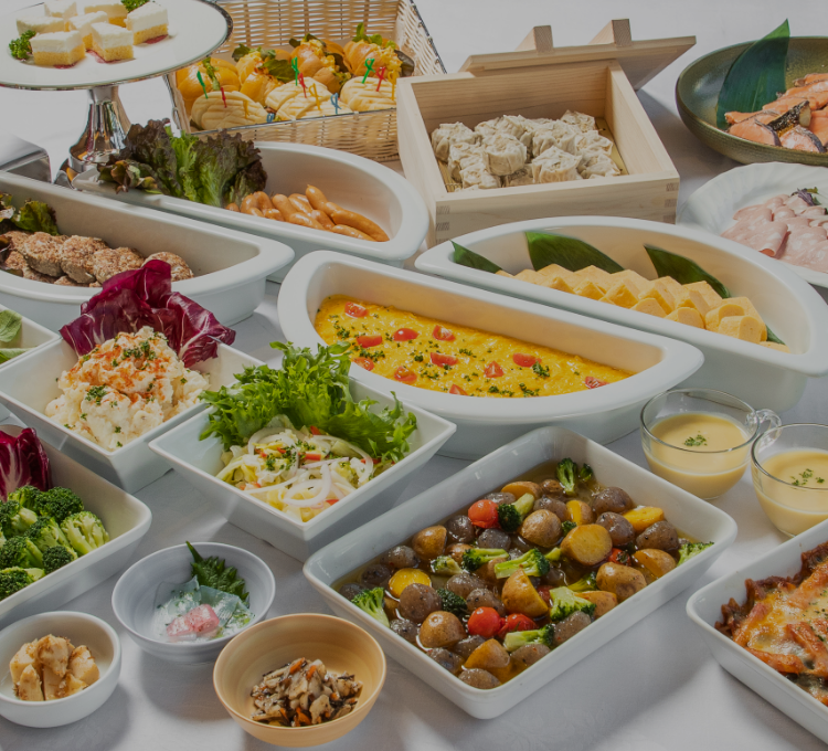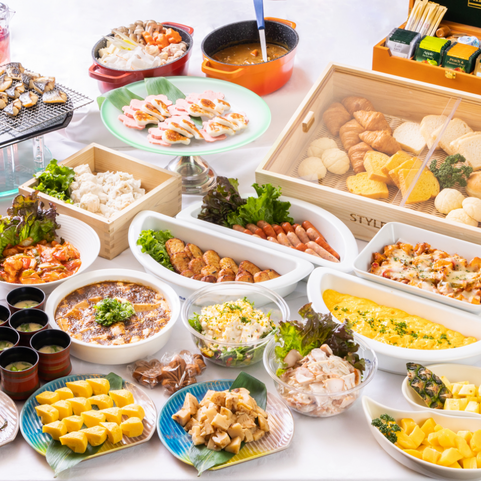 Salad bar / Flower sausage / Roasted Sasayuri pork / Shamoji kamaboko / Hiroshima greens pickles / Conger eel tea/grilled fish/scrambled eggs/gansu/fried Hiroshima greens with fish cakes/Hiroshima-style okonomiyaki/ Nikujaga curry / Hiroshima lemon pot-au-feu or Bishu nabe (choice of one) / Domestic Koshihikari rice / Several kinds of bread / Cereal/yogurt/green smoothie/several desserts (momiji manju etc.)/ Coffee / Soft drinks etc.