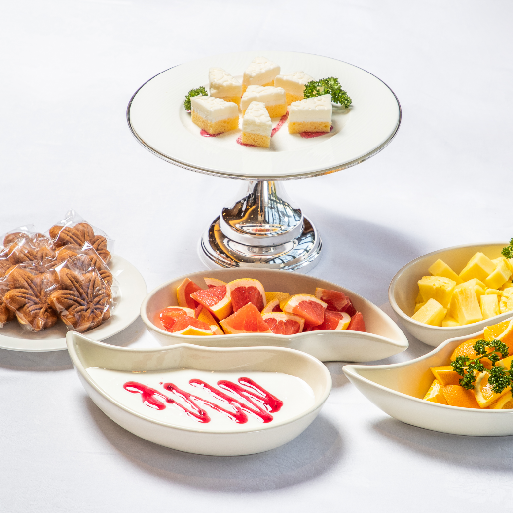 In addition to fruits and petit cakes, Hiroshima specialty "Momiji manju" is also available. Please make sure to enjoy your meal up to dessert.