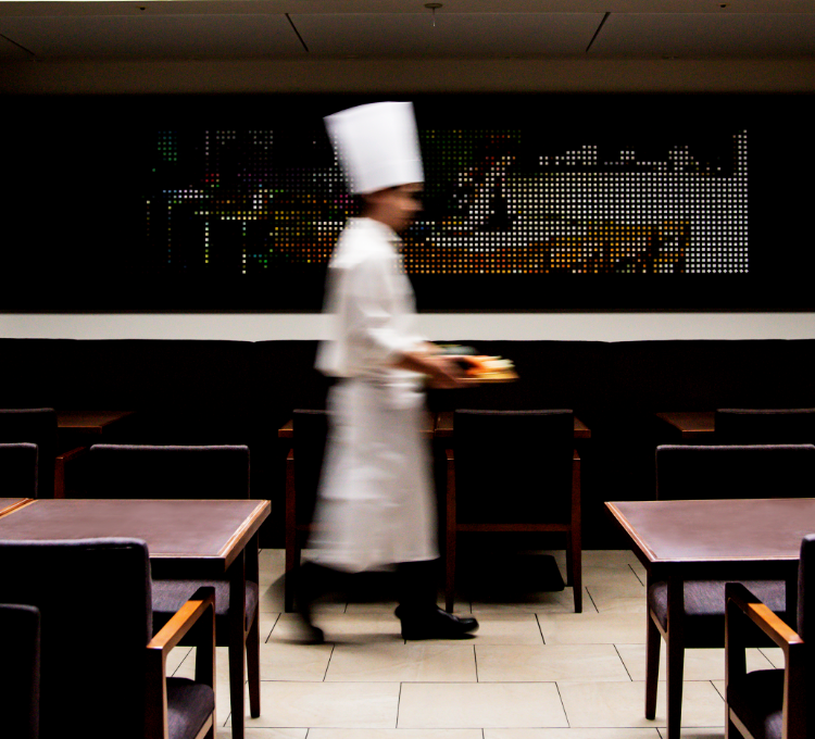 The B1F Restaurant "Monsieur ITOH" has a modern and calm atmosphere with an interior and wine cellar made with the underground storage in mind.