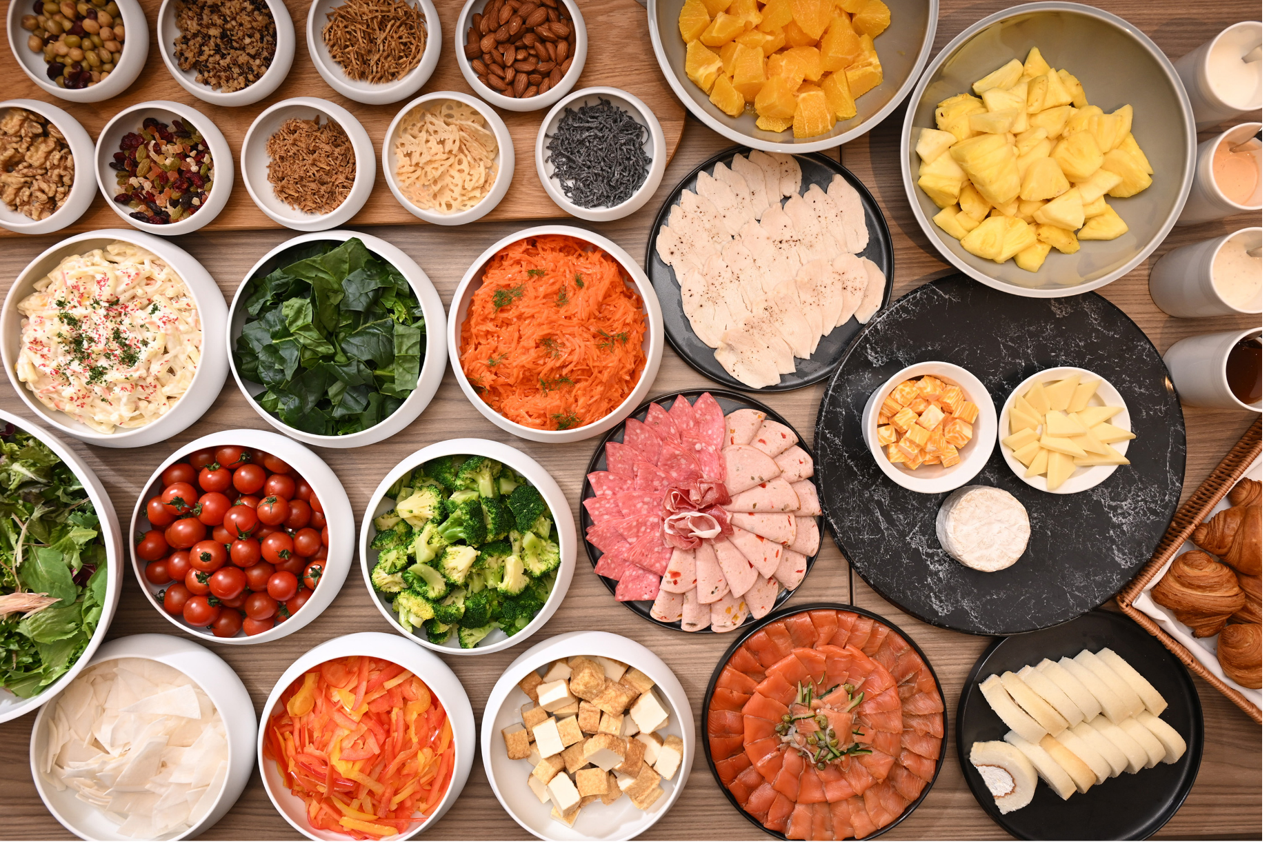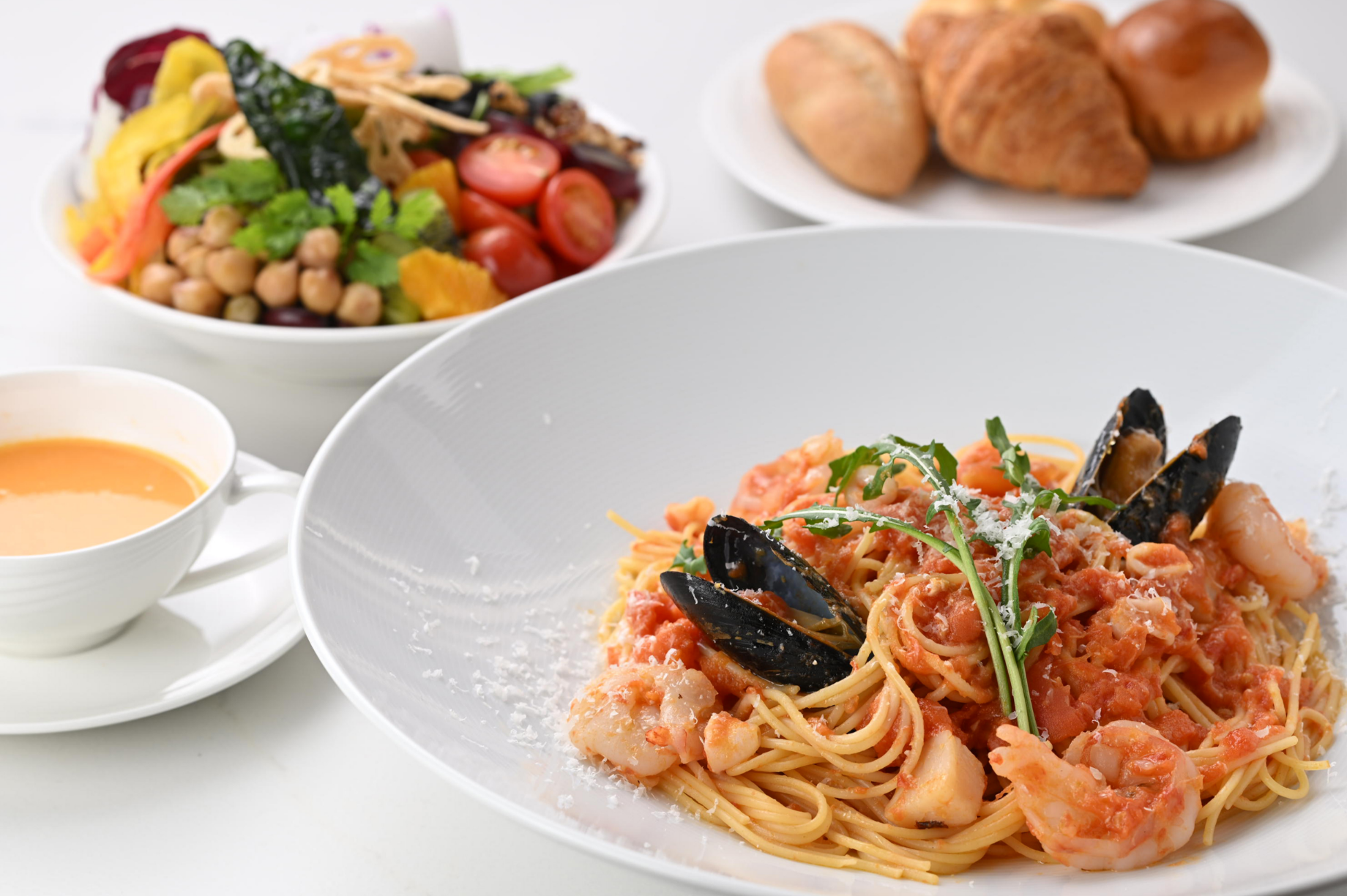 朝食は彩り豊かな野菜やフルーツ、栄養価もプラスできるトッピングなどの素材を揃えた「ウェルネスサラダ」を、ランチは20種類以上のパスタから選ぶ充足感を、