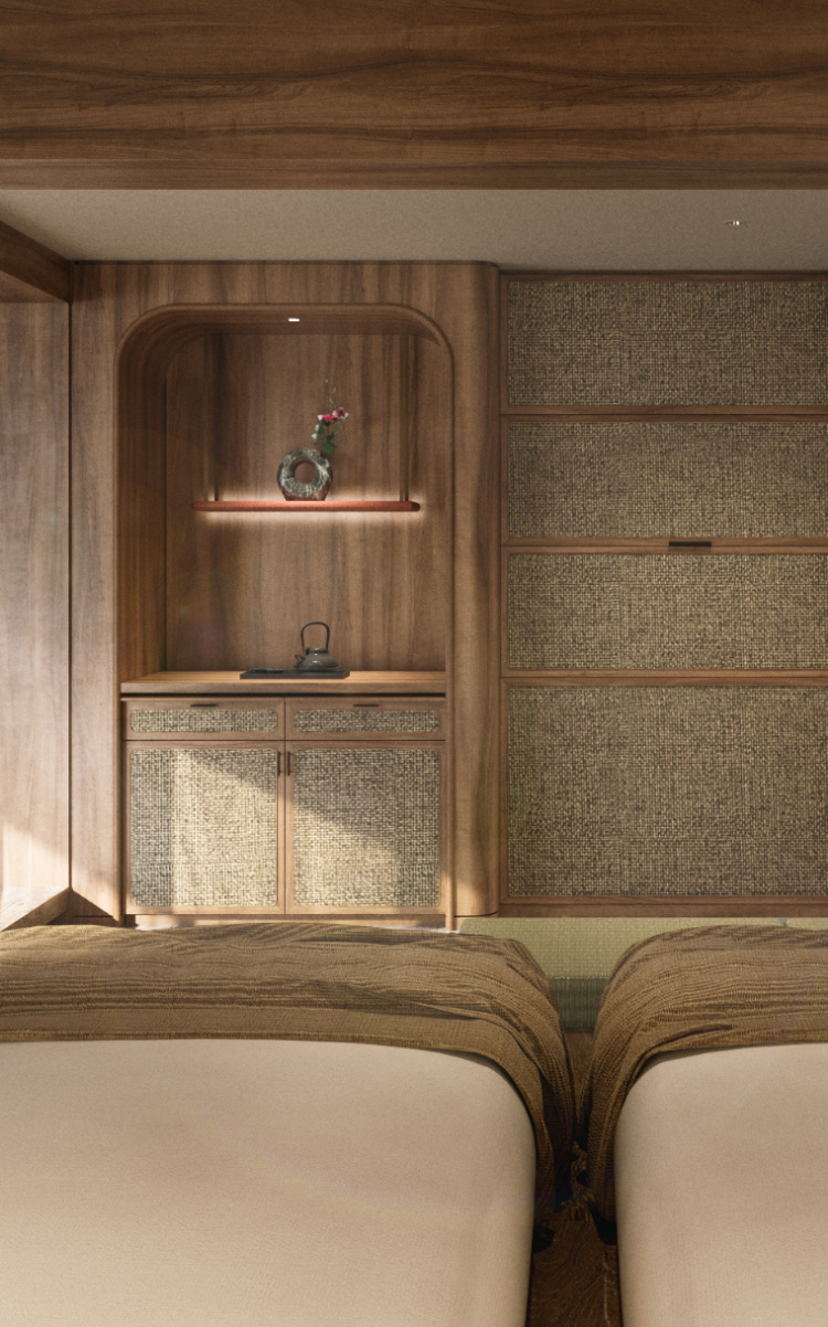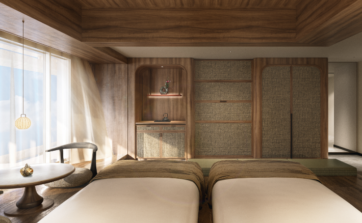 布がゆらめく抜け感のある客室は、ゆったりとした中にも王朝時代のような気品を感じる設え。小上がりで伝統的な陶器でお茶を嗜む時間は、唯一無二の体験です。