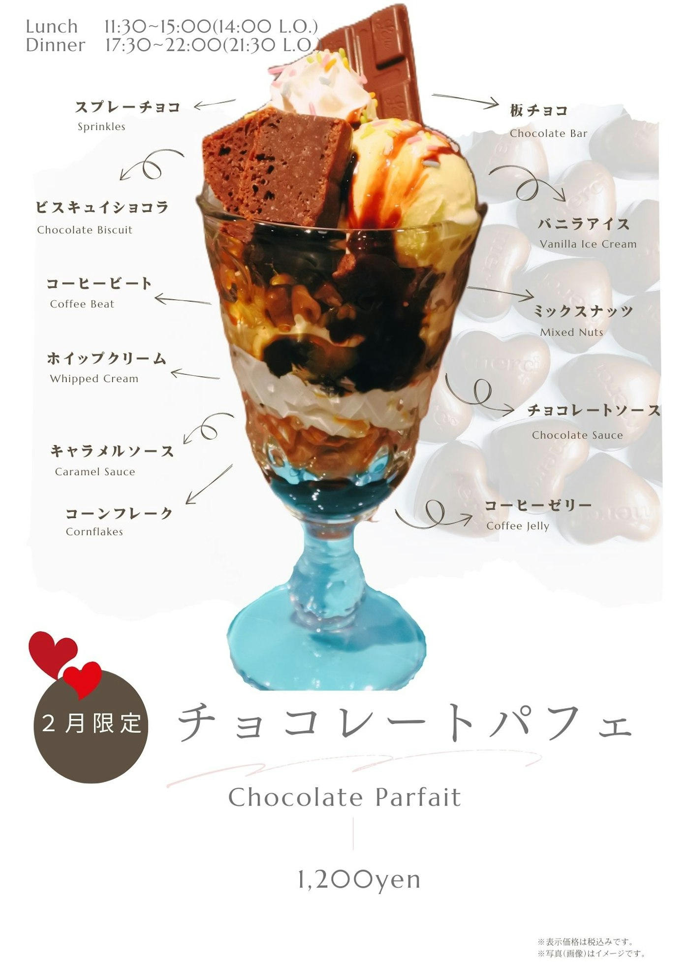 こちらのパフェはランチタイム&ディナータイムにお召し上がりいただけます。