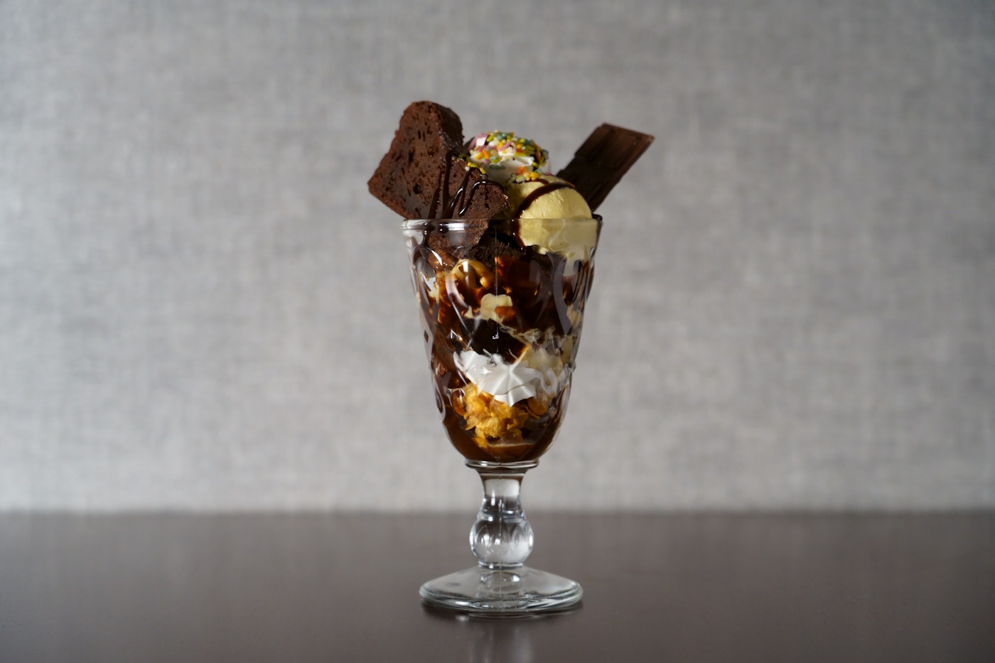 チョコレートを練りこんだビスキュイや、彩り豊かなホイップ、芳醇なバニラアイスが織りなす華やかなパフェ。食べ進めると甘いチョコレートソースを纏い、カリッとした食感が楽しいコーヒービートやミックスナッツが現れます。