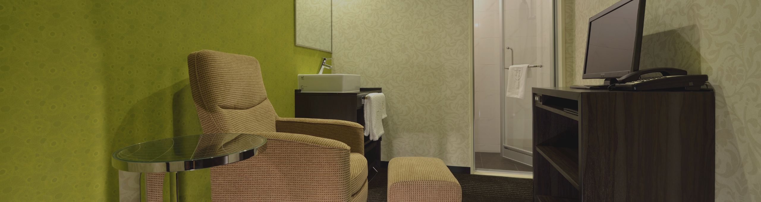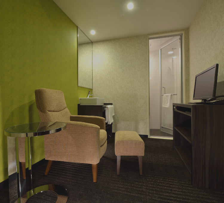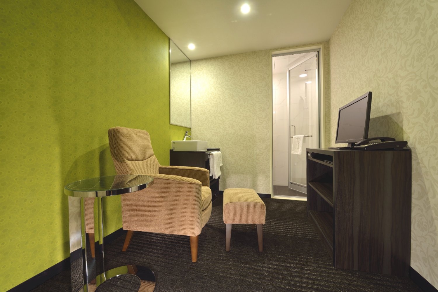 シャワーブース、ソファ、テレビを設置したお部屋です。ベッドはございません。
