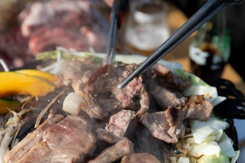 一个燃烧着生物乙醇火焰的火坑,一个出售北海道产品和食材的市场,