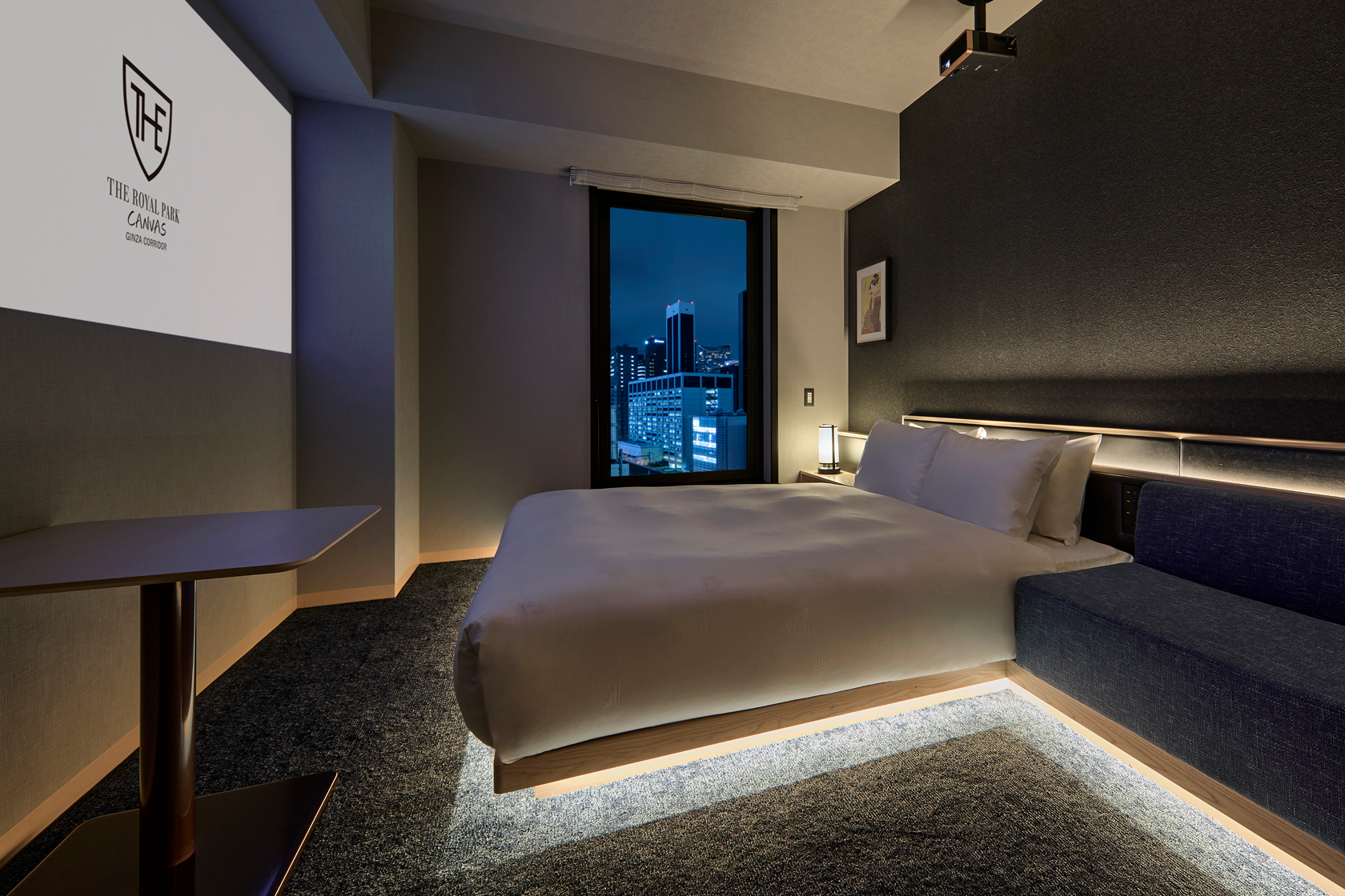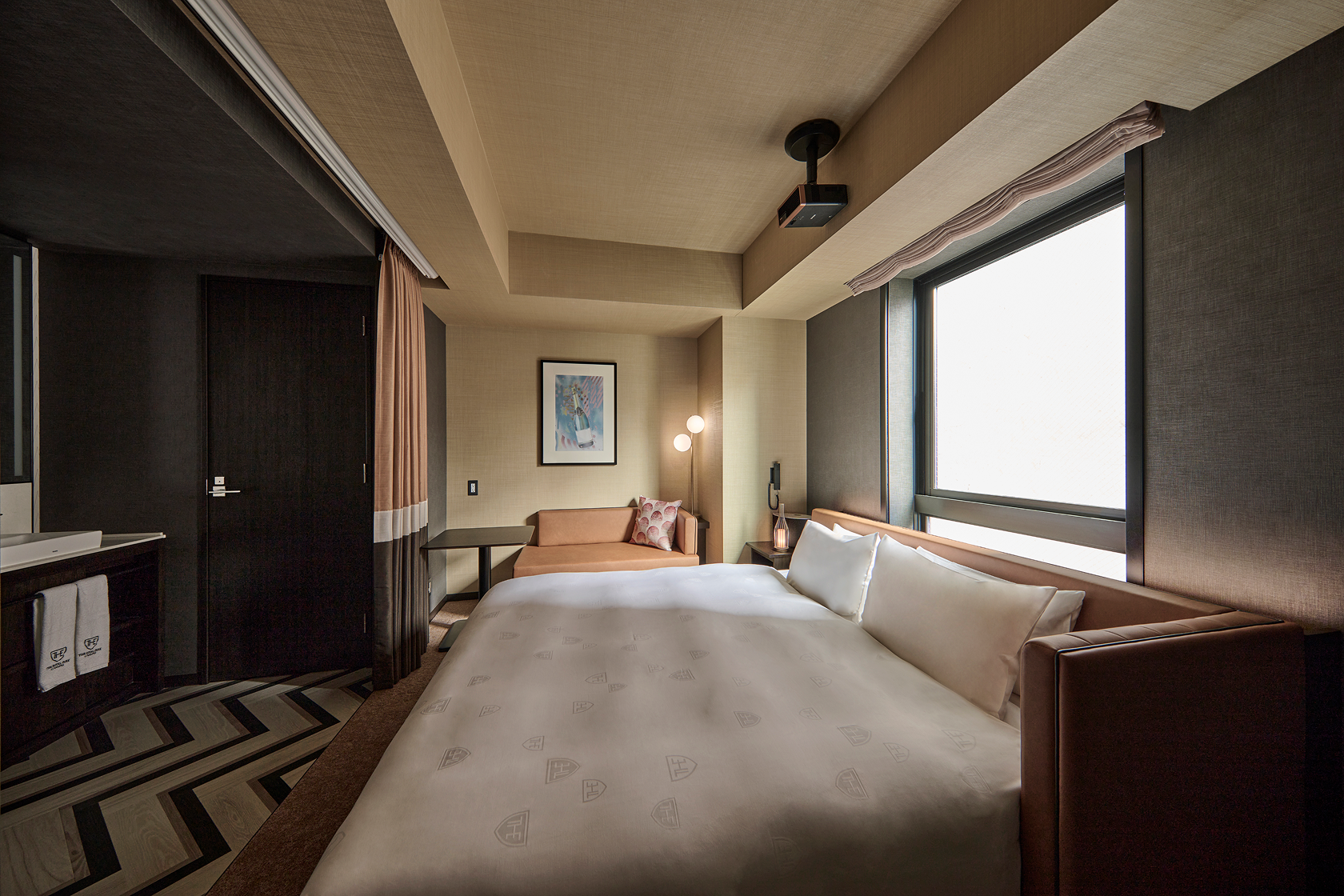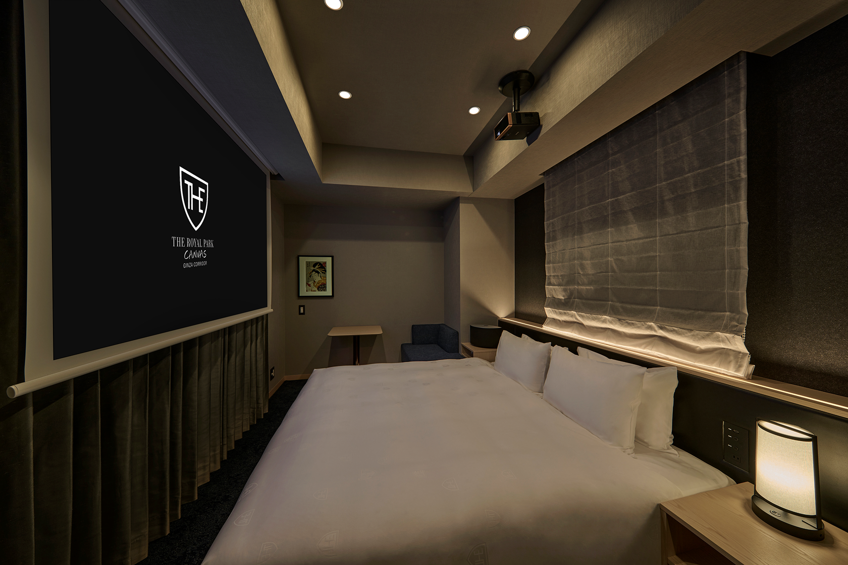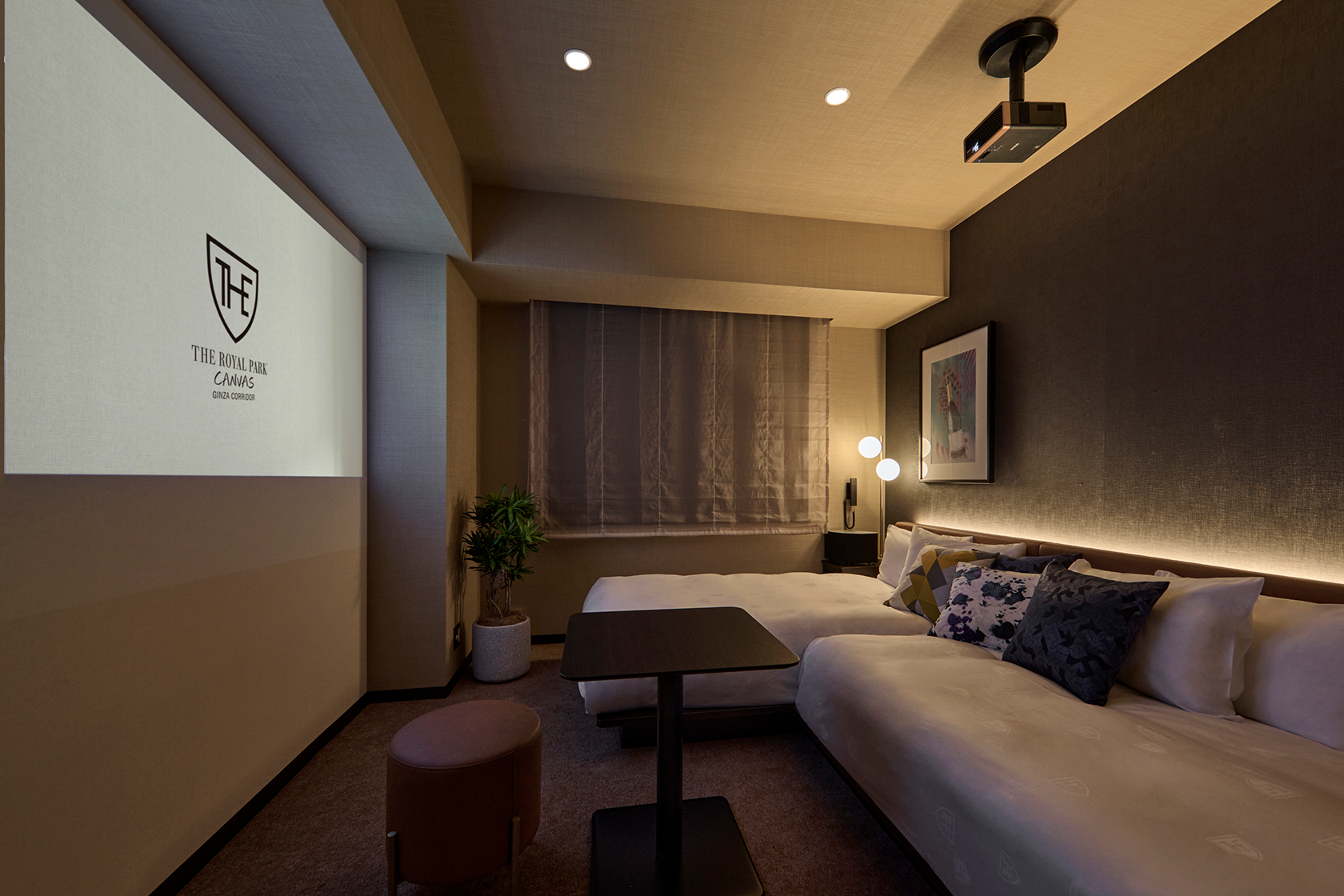 和を嗜む客室。シームレスとラフ、素材のコントラストが作り出すストイックさが落ち着きをもたらす場所。くつろぎとEntertainmentという新たなコントラストを生む、コリドー街ならではのおもてなしを形にした客室。