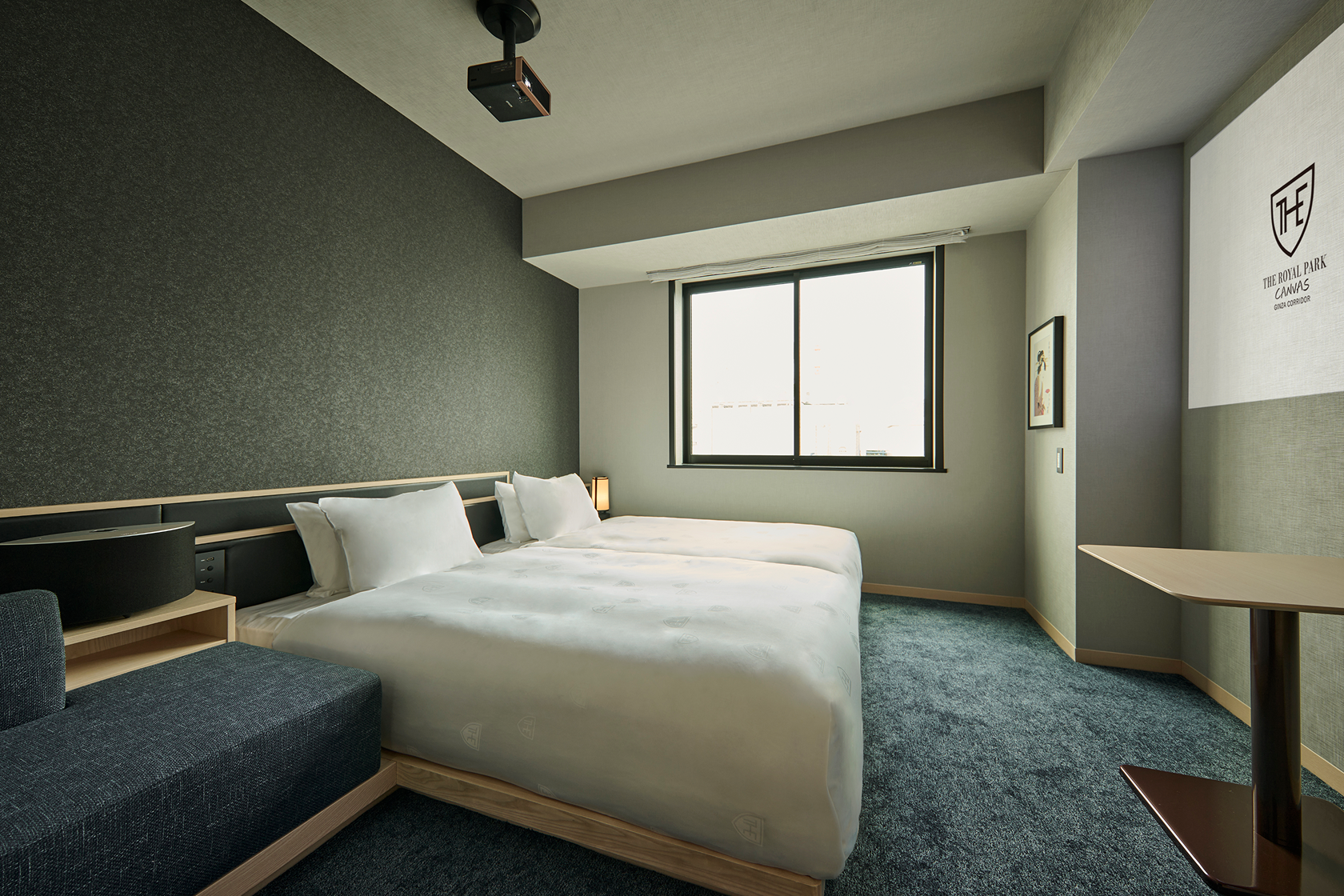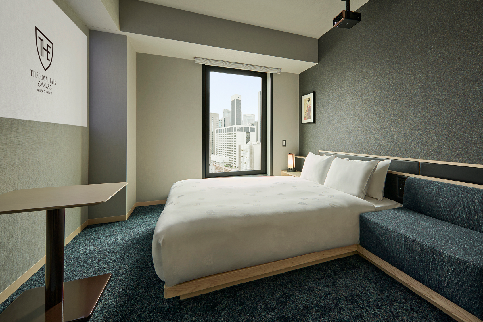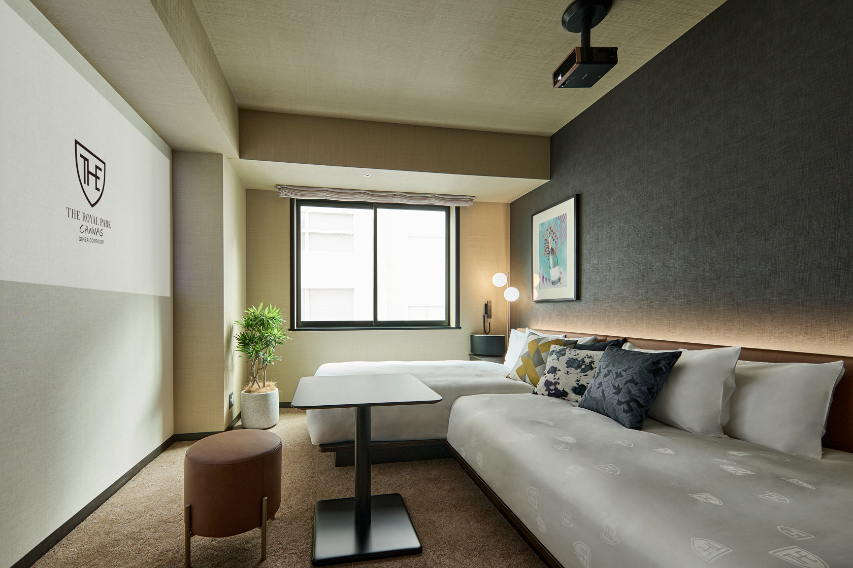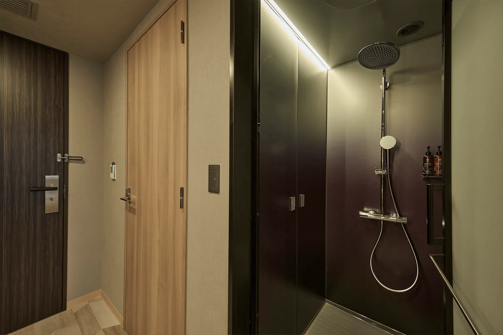 和を嗜む客室。シームレスとラフ、素材のコントラストが作り出すストイックさが落ち着きをもたらす場所。くつろぎとEntertainmentという新たなコントラストを生む、コリドー街ならではのおもてなしを形にした客室。