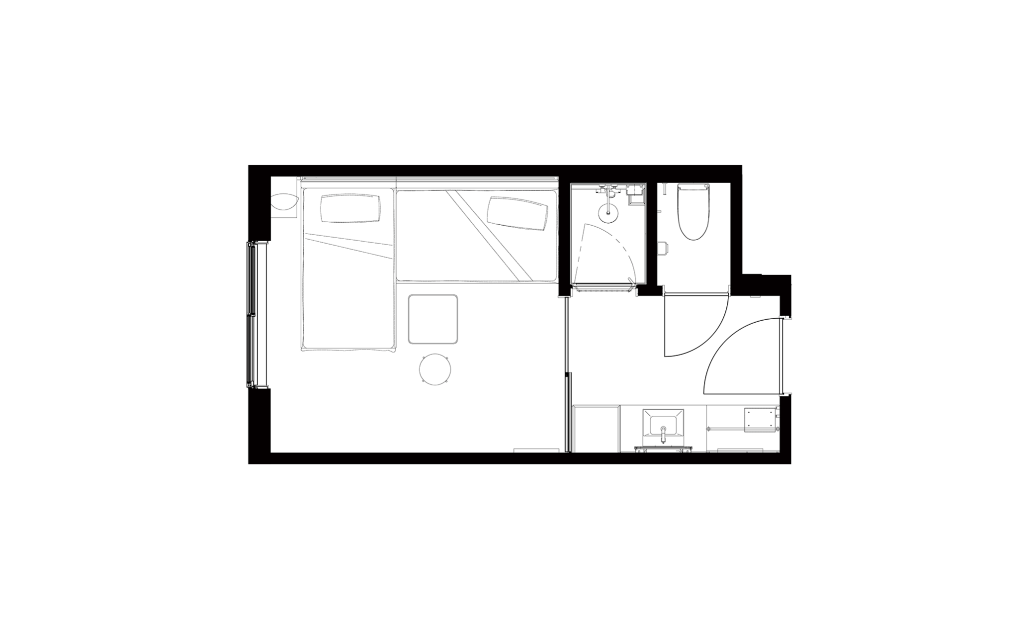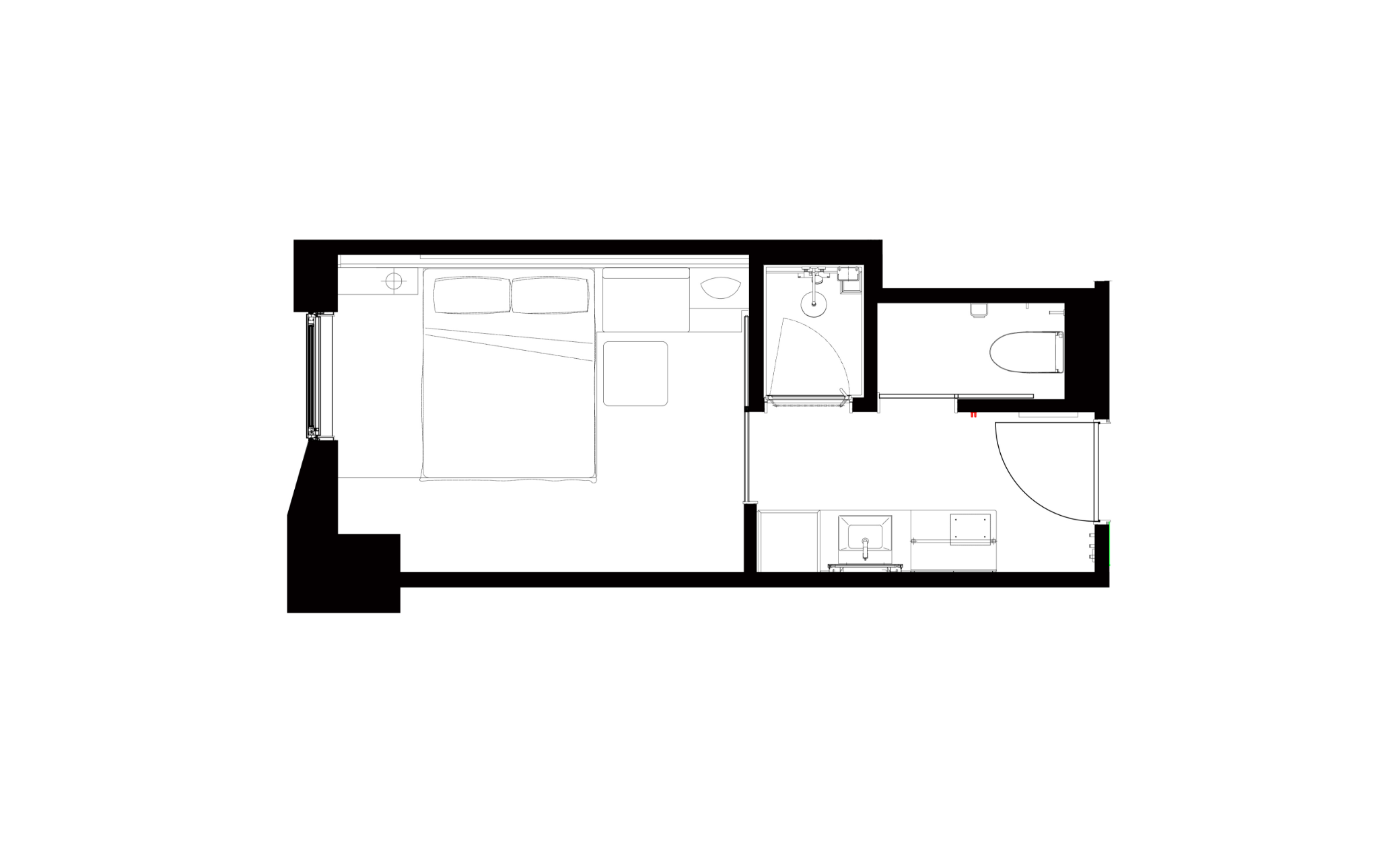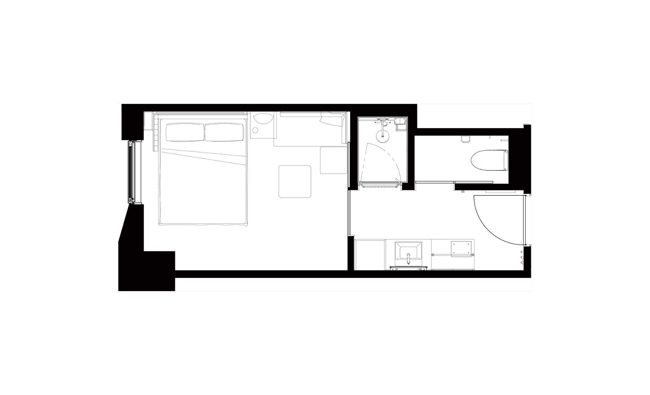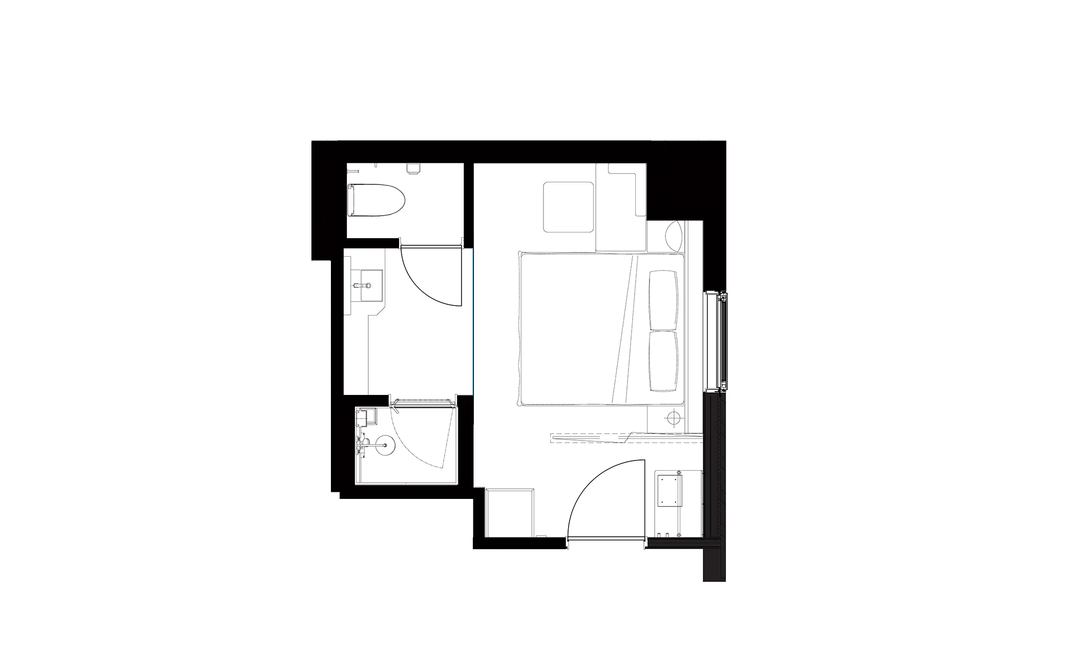 和を嗜む客室。シームレスとラフ、素材のコントラストが作り出すストイックさが落ち着きをもたらす場所。くつろぎとEntertainmentという新たなコントラストを生む、コリドー街ならではのおもてなしを形にした客室。