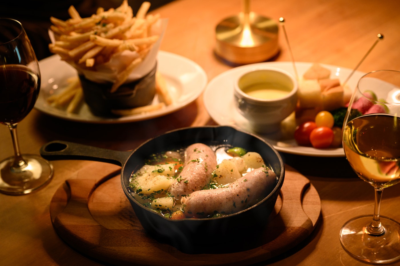 濃厚でクリーミーな味わいが楽しい「チーズフォンデュ」や、愛知県産生フランクのポトフなど、テラスプランも冬仕様でご用意