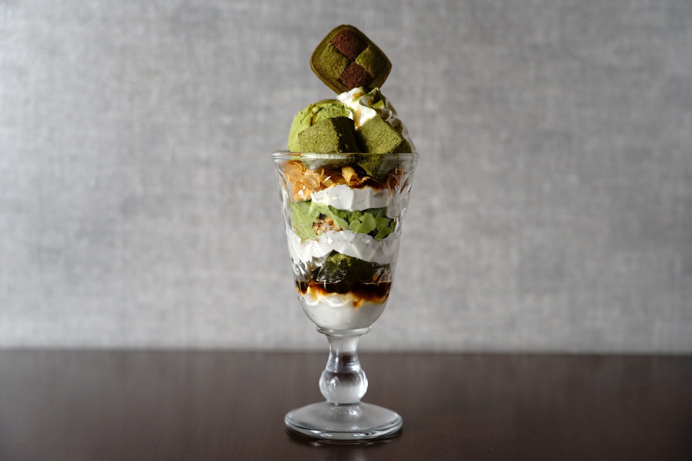 裝飾在芭菲上的抹茶甜點,在融化的瞬間蔓延開來,如同剛採摘的茶葉般的清爽香味,讓您盡享舒適的微苦。