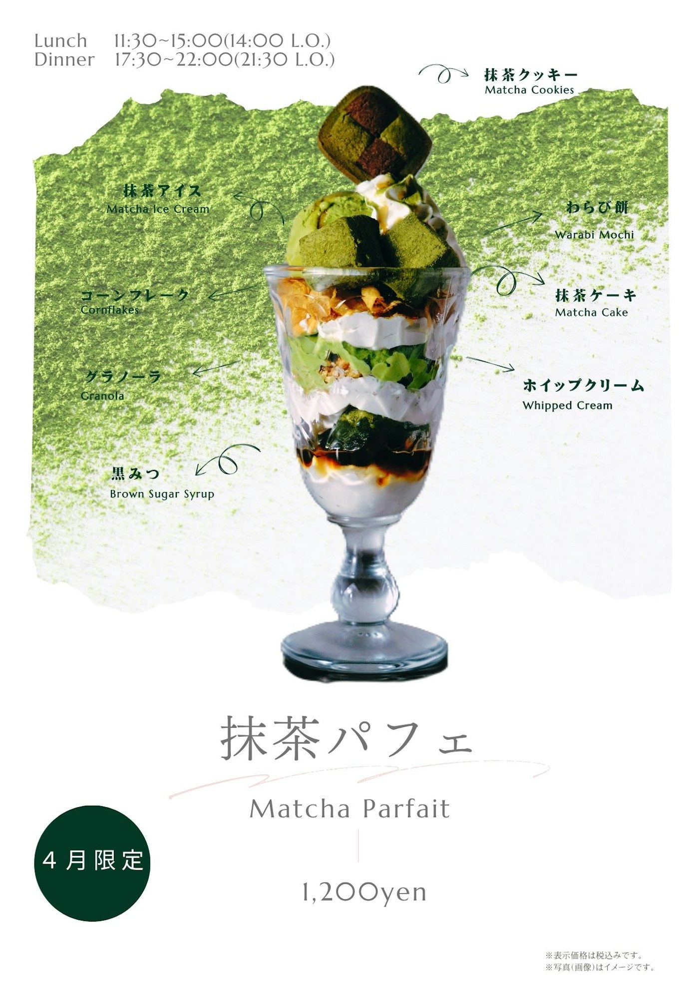 四月份,我們準備了“抹茶芭菲”,讓您充分體驗抹茶的美味。