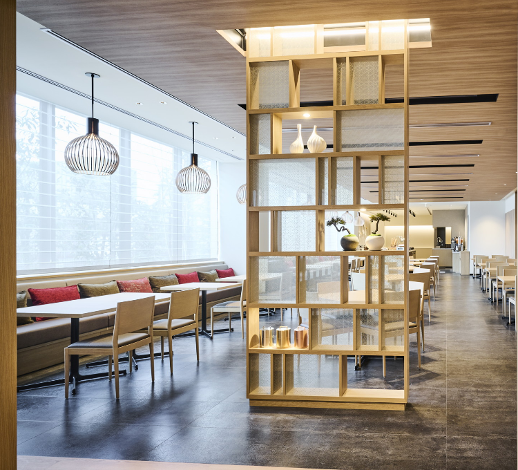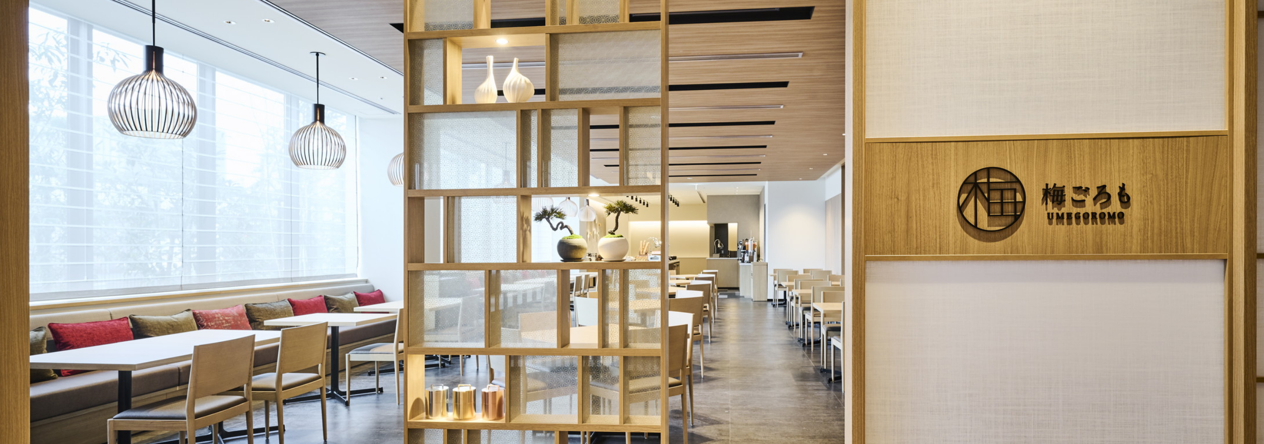 餐廳 "Umegoromo"。店內展示著京都老字號開化堂的茶碗、茶罐等立體造型的物品。