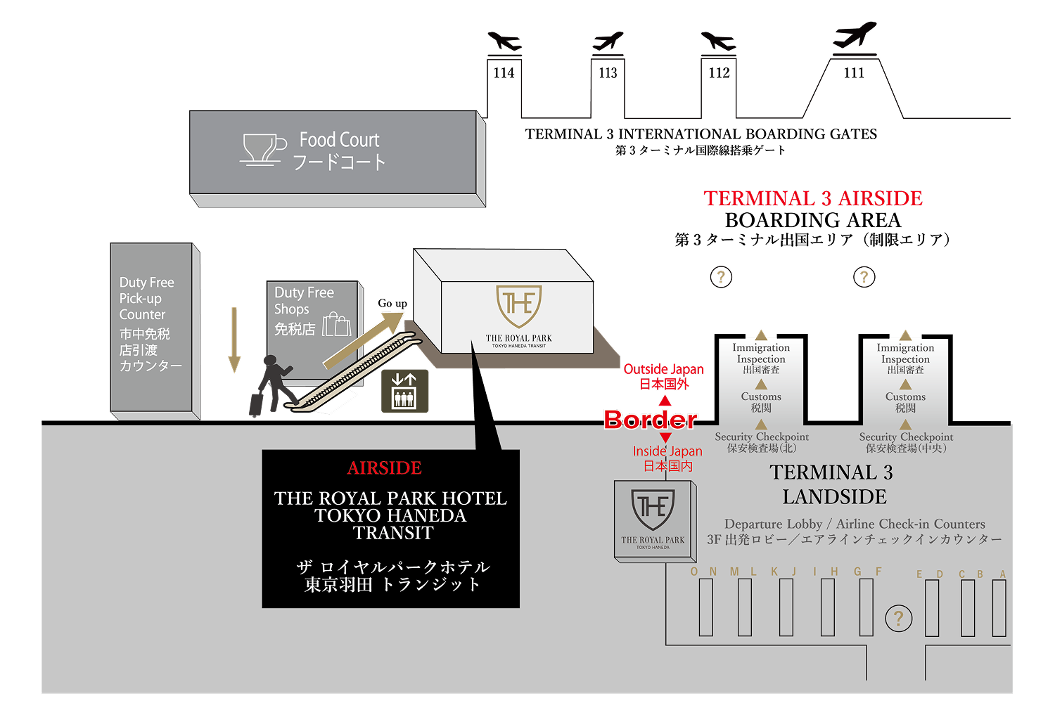 過境酒店入口位於第3航廈出境區(管制區)內,鄰近國際線114號登機門。
